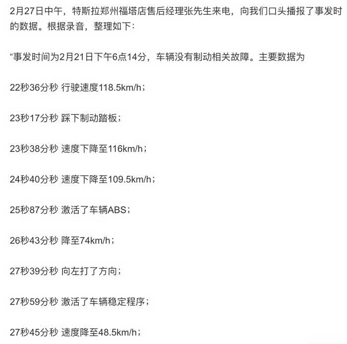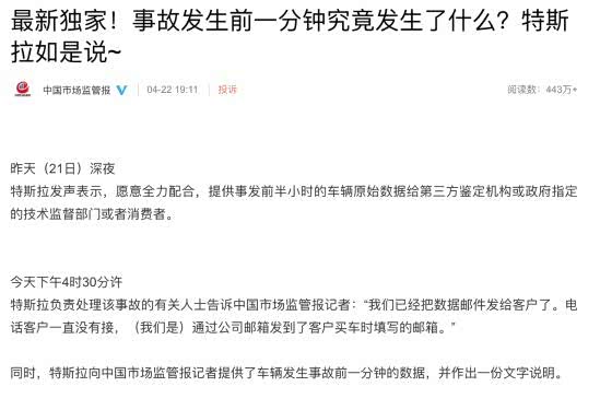 4月22日,特斯拉表示已将数据通过邮件发给客户。并向中国市场监管报提供了车辆发生事故前一分钟的数据。