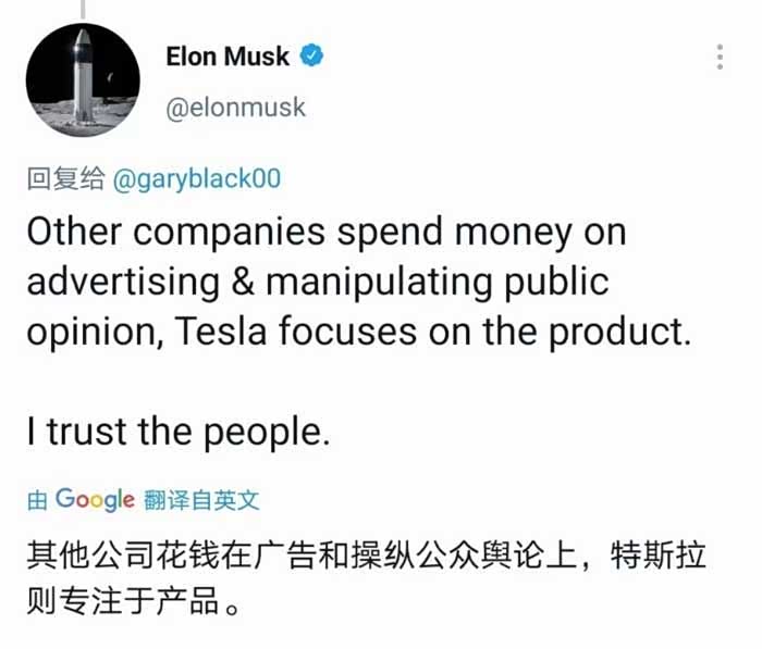 4月29日 马斯克在推特上发言回应雇佣公关的提议:“其他公司花钱在广告和操纵公众舆论上,但特斯拉专注于产品。我相信人民。”