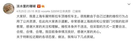 4月25日,特斯拉维权女车主被释放。张女士微博表态:为自己的过激行为表示道歉,并提出多处质疑,表示要继续维权到底。