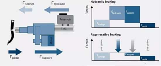 RBS——制动踏板力和制动轮缸液压力是非解耦的,也就是说,二者是相互关联无法各自独立动作的。在制动过程中,只要踩下制动踏板,制动轮缸就会产生液压制动力,而电机制动(即制动能量回收)仅是叠加在此制动力上。所以还是有一部分能量损失掉了,能量回收率较低。不过,由于电机制动力与液压制动力是按比例分配的,因此控制起来较为简单。