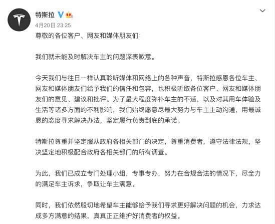 特斯拉20日深夜发文“深表歉意”,成立专门处理小组,专事专办。