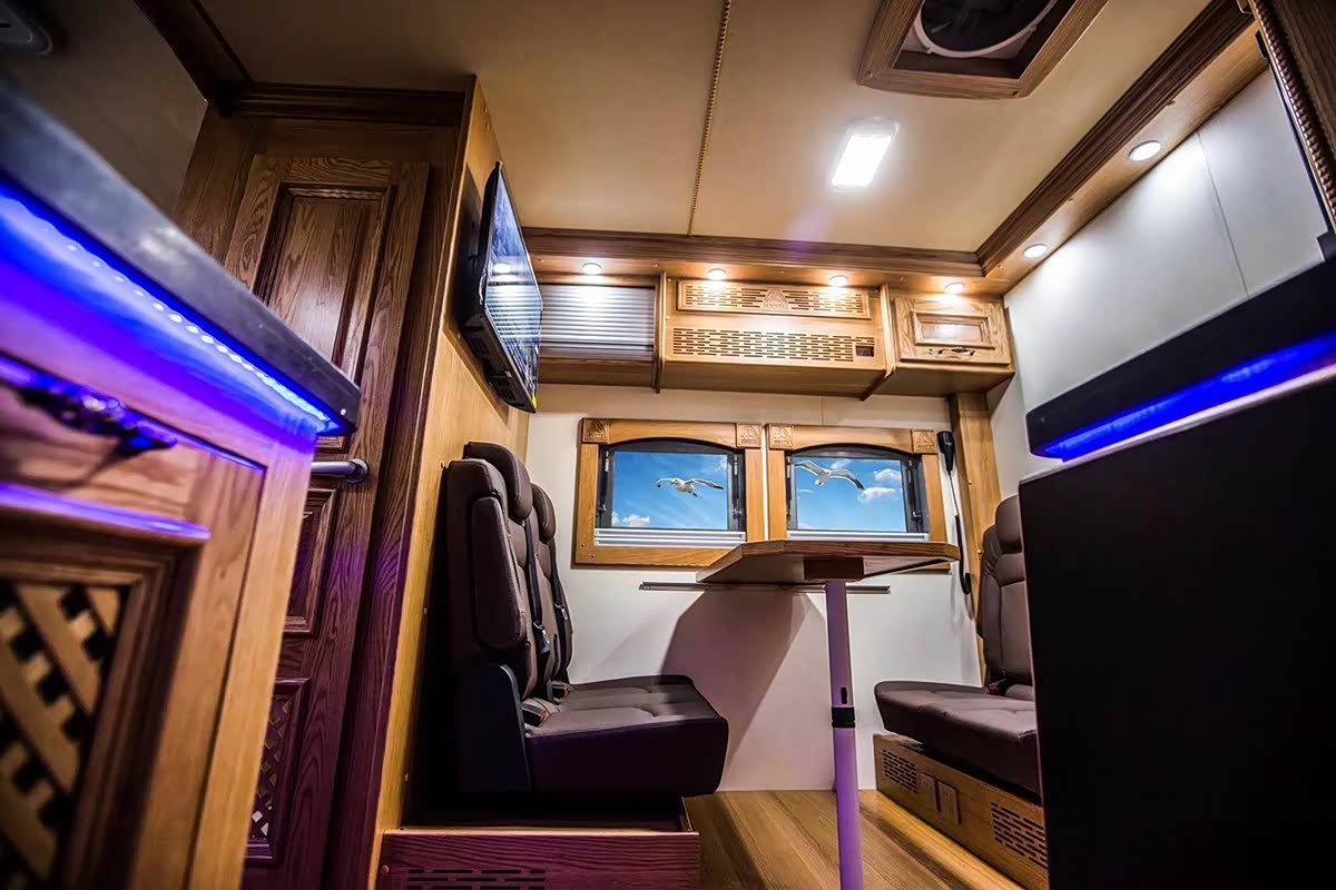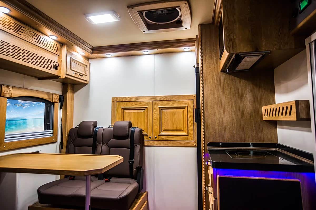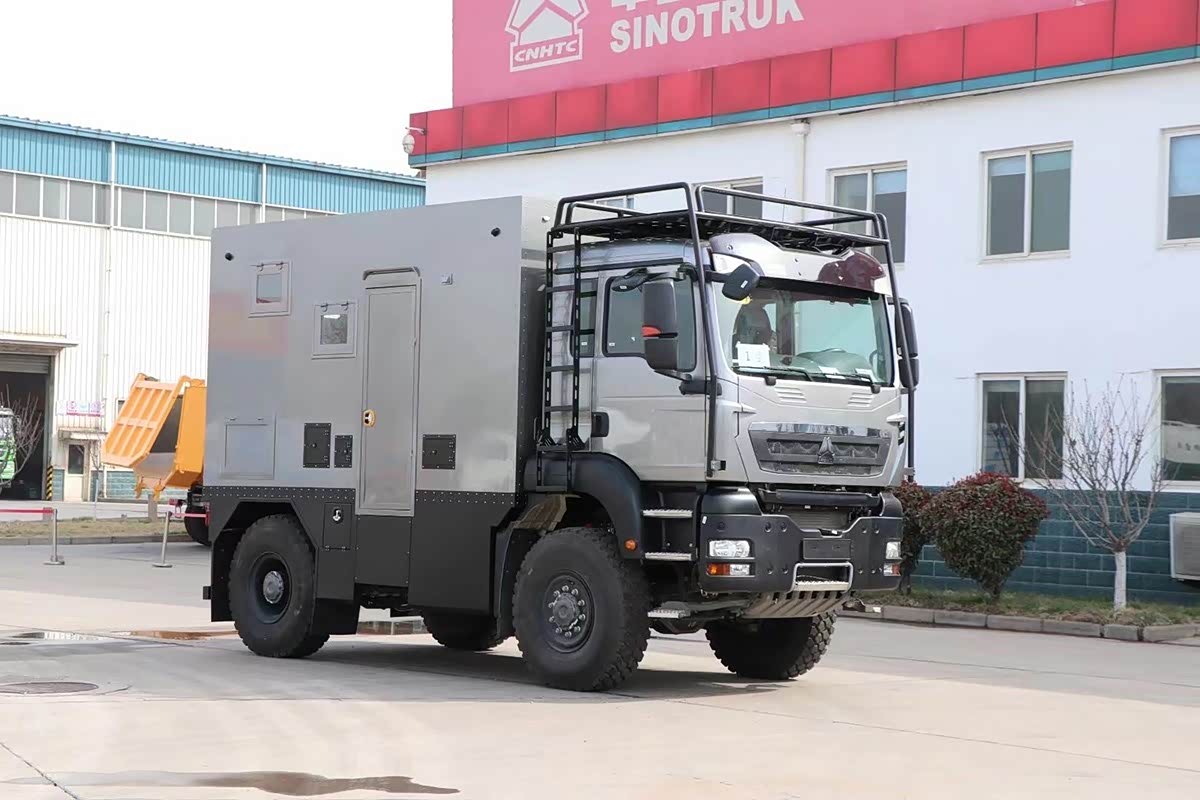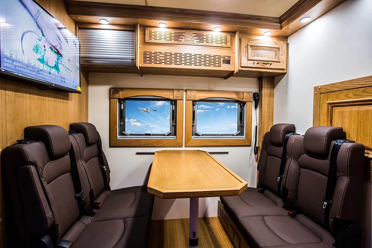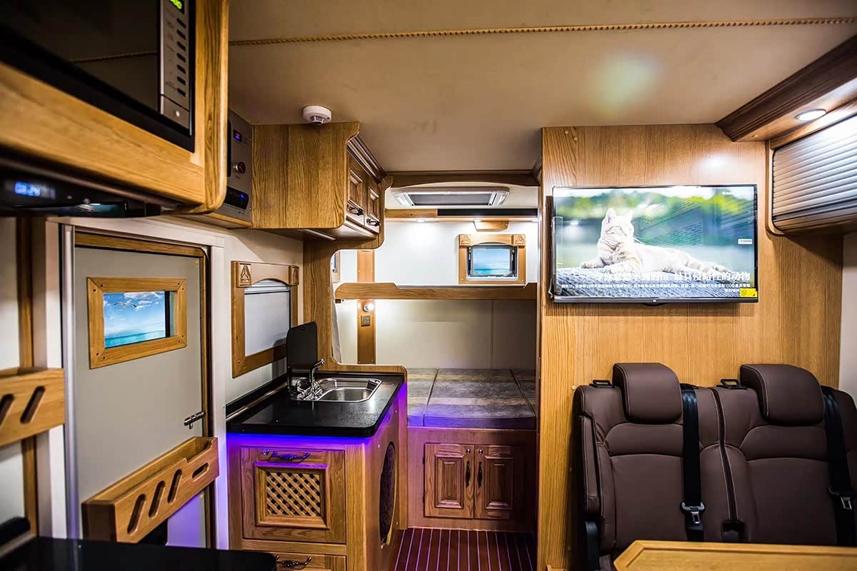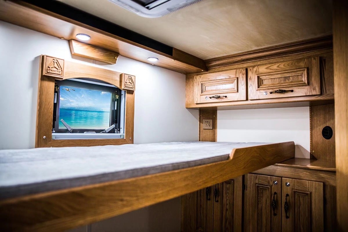 这是中国重汽和德国MAN合资打造的底盘车型,实际上就是采用德国MAN的底盘技术,也是国内首款搭载四驱系统的汕德卡房车,由中国重汽原厂改装。这款车最大的好处就是配备了四驱系统,当然如果大家对四驱不是硬性要求还有两驱版本可选。车内是一张后横置上下铺设计,驾驶席后方是一张对卡座沙发,车内的装饰风格为中国古典家具,最大可核载6人。动力方面,搭载一款6.9升柴油发动机,匹配10速手动变速箱,最高功率270马力,国六排放,需要加尿素。别看这么大一款房车,其实论车身长度来上牌照,它却地地道道是一款上蓝牌C本就能驾驶的房车,是不是很意外?这款车目前售价还不清楚。