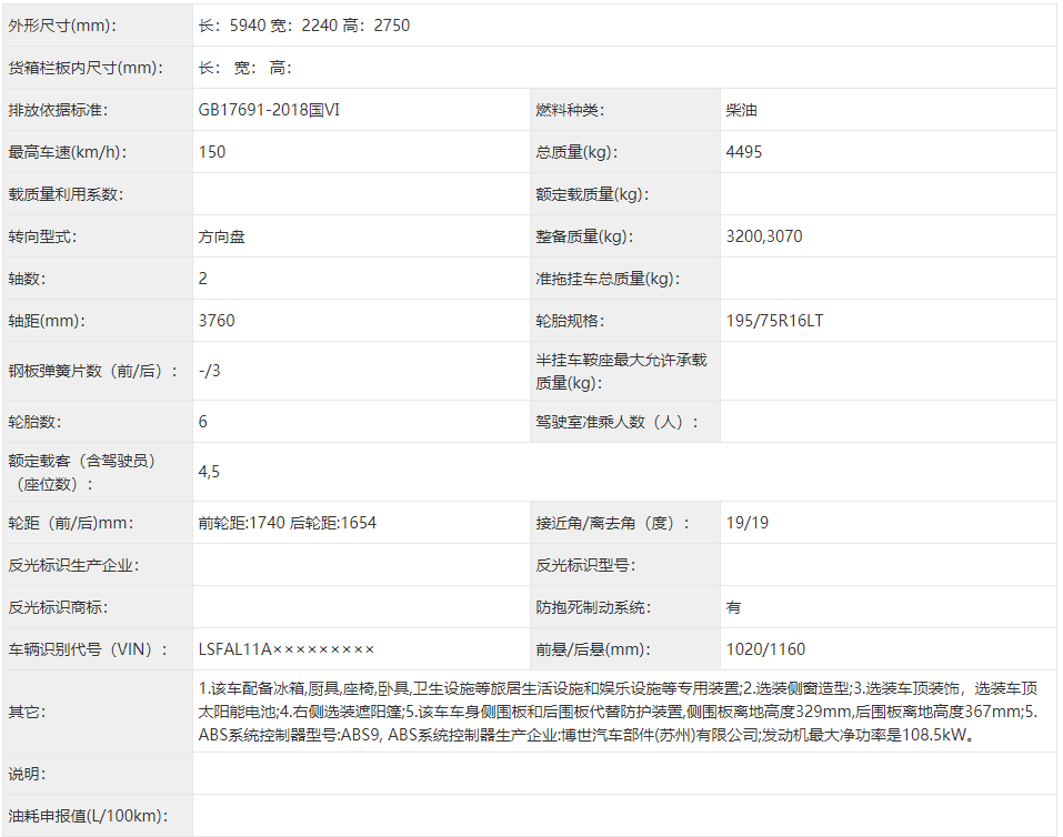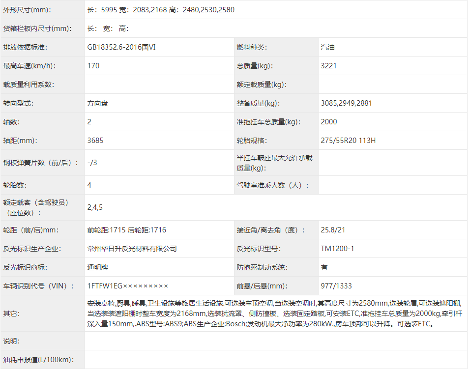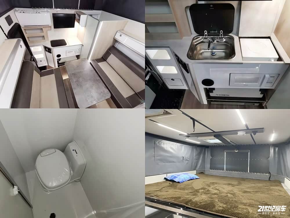 这款车是由江西钧天机械有限公司改装的一款皮卡房车,从公示图片来看,整车采用升顶设计,箱体部分方方正正有点硬派越野房车的味道,不过这车的颜色搭配看起来有点不太协调。该车选用的是福特F150皮卡改装,搭载一款3.5T汽油涡轮增压发动机,匹配10AT变速箱,最高功率280kW。整车整备质量接近3吨,而最大总质量为3.22吨,该车的承重稍弱一些。车内家具和色彩搭配看起来还不错,由于是软质升顶机构,升起来之后驾驶室顶部是一张相当大的床位,客厅区域采用横置双沙发布局,可拼床。而卫生间和厨房则放置于车尾部分,简单干练。这款车最大的意义是改变了皮卡货车的属性,变成了旅居车,不再有报废期限。不过,对于这样一款越野型房车来说,一家2-3口人出行,轻露营,去一些其他车型去不了的地方也挺好。