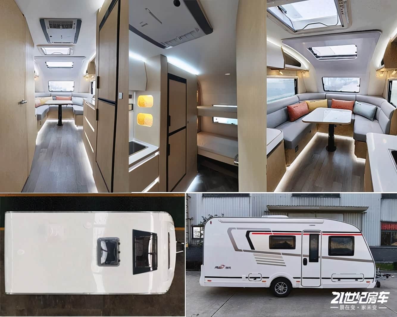 瑞弗房车刚刚于5月13日新车发布会推出了首款拖挂产品D470,而今天我们在工信部公示栏中又看到了一款全新的公示车型,这款车相对于昨天发布的新车型略大一些,内部布局也不太相同。由于外形设计基本差别不大,我们上图用D470作为展示。而内部虽然和现款新车D470有相似之处,但最基础的布局是完全不同的,公示车型采用前舱大环形沙发设计,车尾则是上下铺布局,中置卫生间和厨房区,相对于D470来说,公示的这款车内部空间更充足。