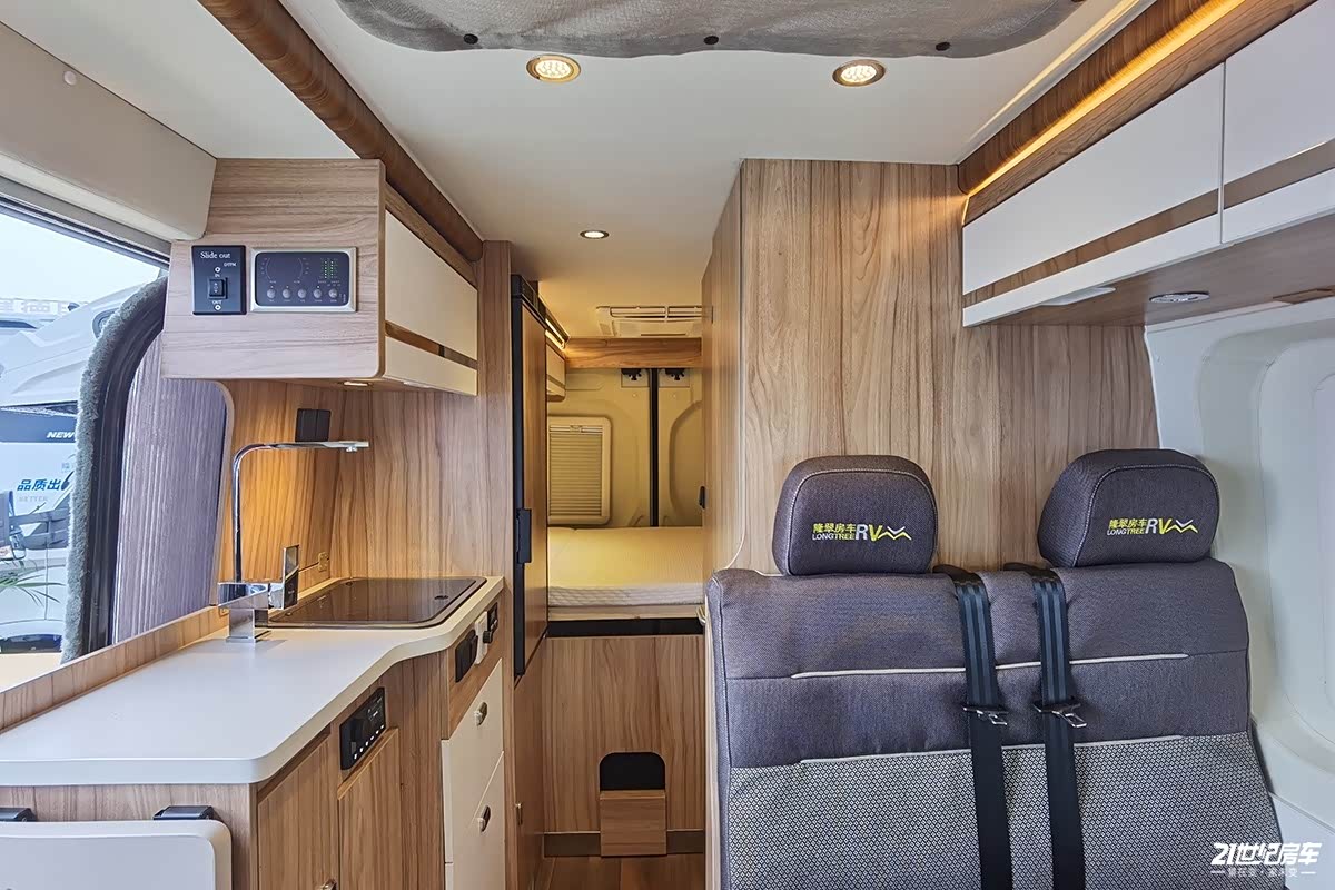 这款车是隆翠房车十堰工厂继隆翠1、2、3号房车之后的又一款高端车型,它定义为跨界型房车,目前这款车还处于概念阶段,有消息称该车的价格并不低,但没有确切的售价消息。不过这款车确实很有特色,整个车顶切割之后,匹配了一款采用玻璃钢开模的大顶,这款车顶的设计还是比较超前的,而且造型犀利,露营时可将车顶打开内部是一张双人床。这是一款核载4人的车型,申请公告栏中可以再增加一人,最大核载5人。车内基本上还是沿用了隆翠目前在售的1/2/3号车的家族风格,高级轻量化进口家具板材,富声音响系统,多功能厨房,大后横床等等。