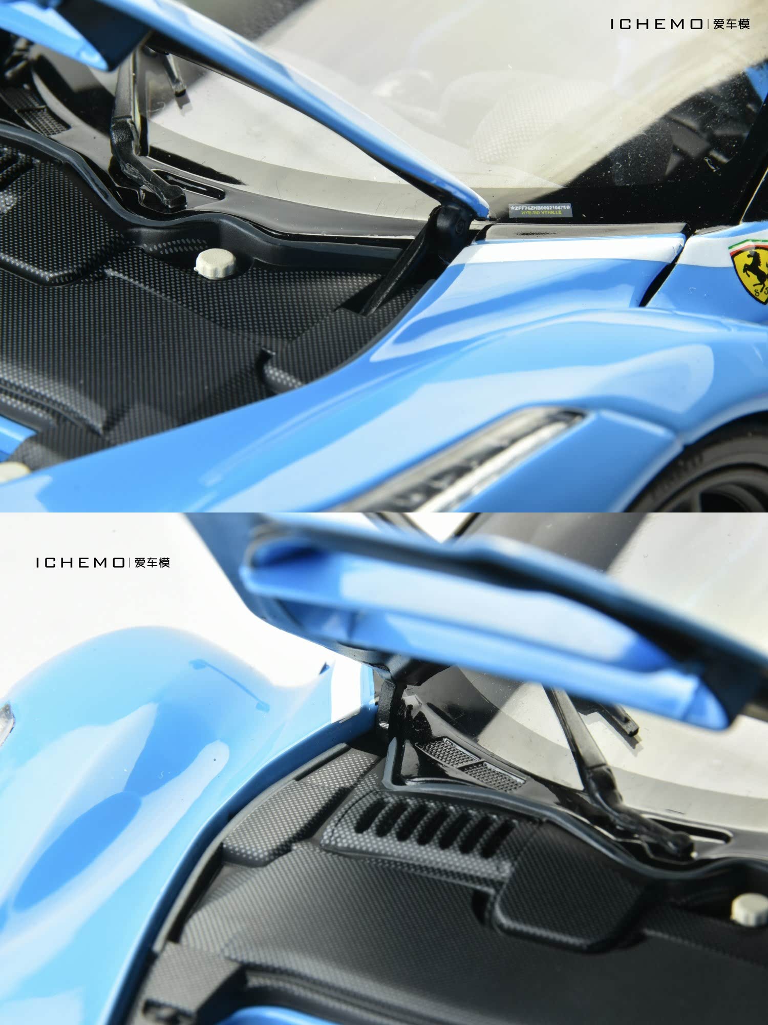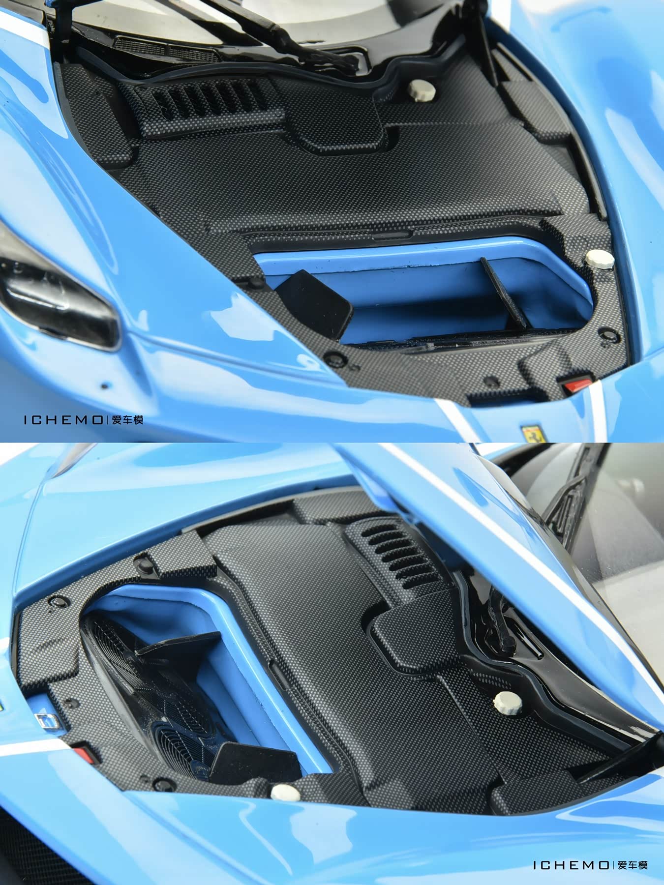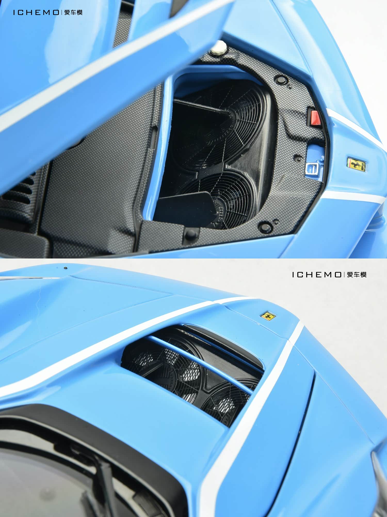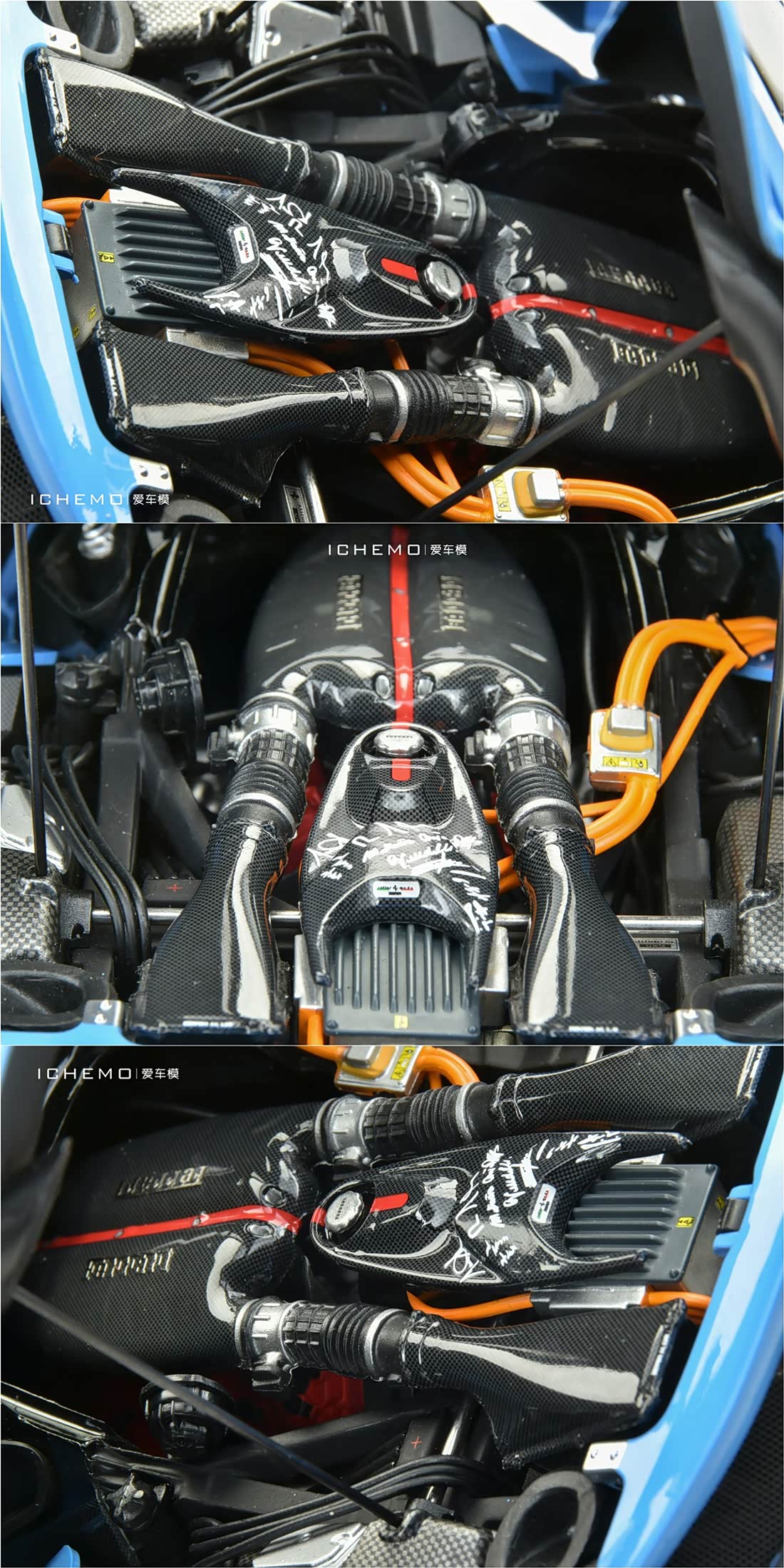 除涂装外,“Baby Blue” 的另一大特征是发动机(电机组)护罩上有签名,据说是 Ferrari 众工程师亲签,模型方面也还原了这一细节。顺便一提,网传这签名就是 “贾先生不洗车” 的直接原因。模型上这颗 V12 发动机可见包括本体在内的 “上层建筑”,但并不是完全独立结构;和内饰一样,发动机处 “碳纤维” 亮面也均有光油覆罩。