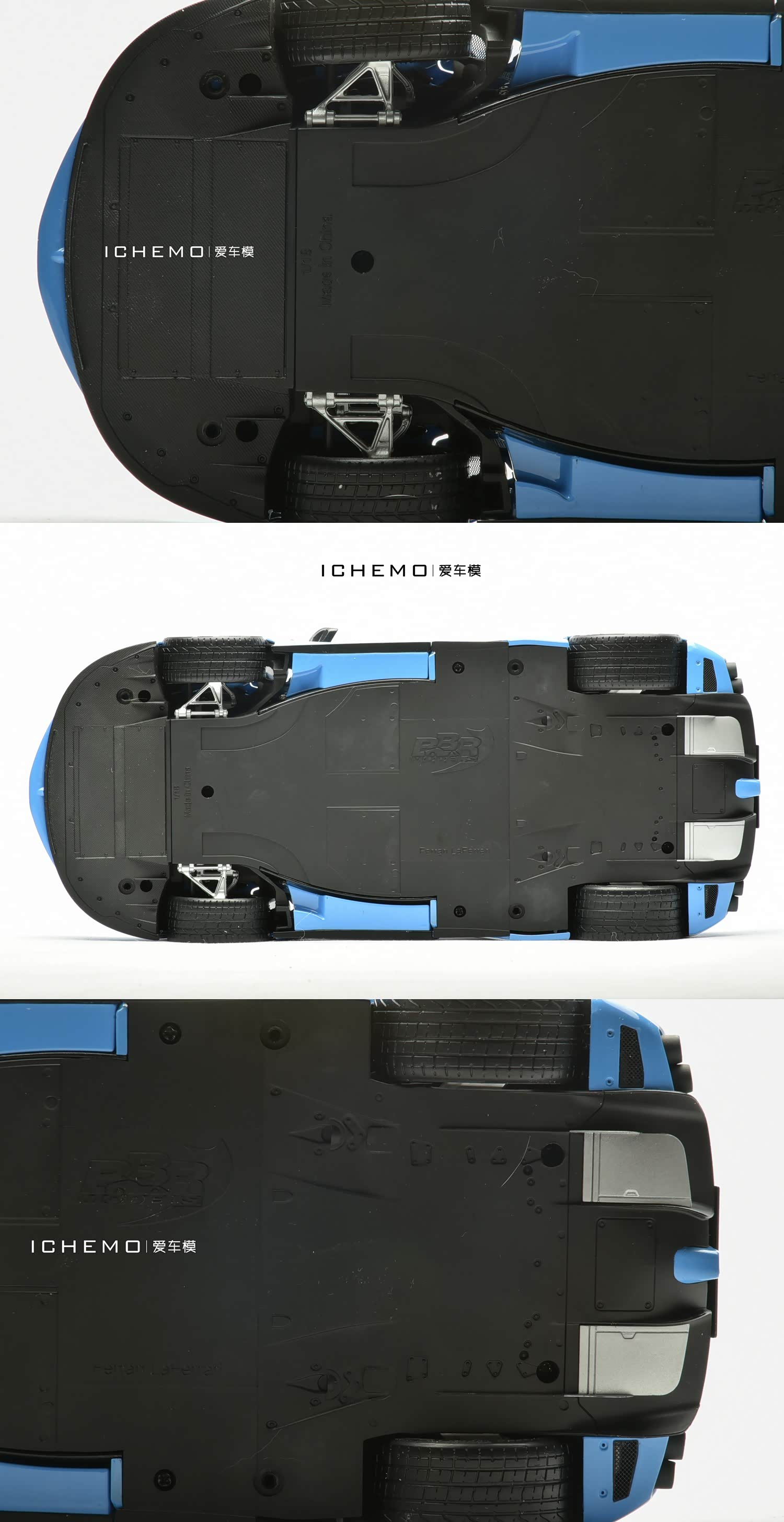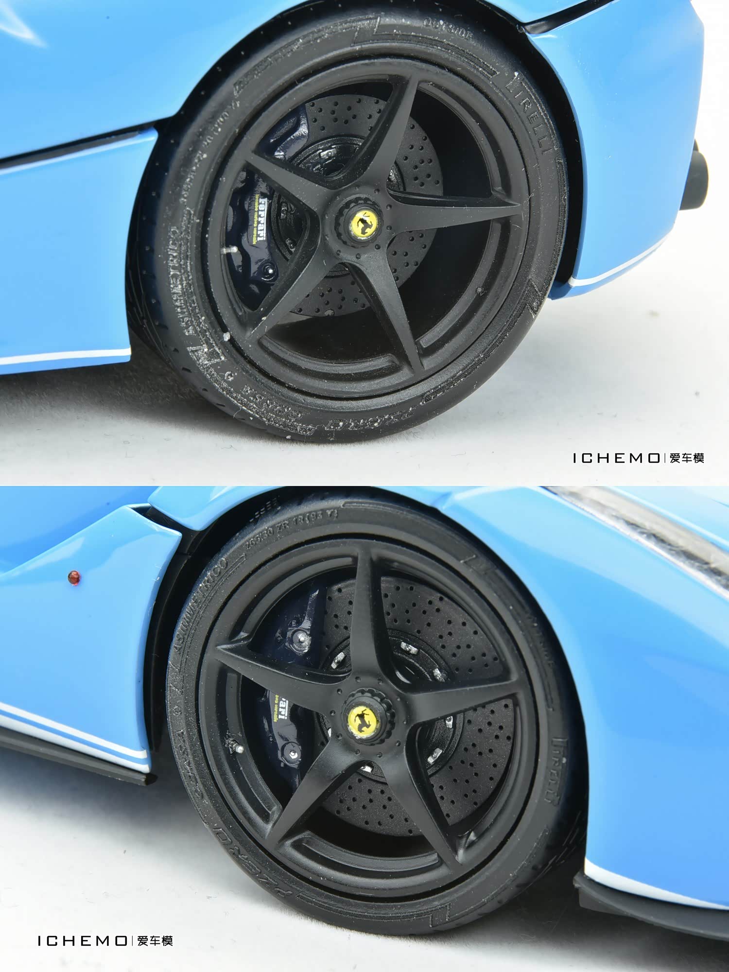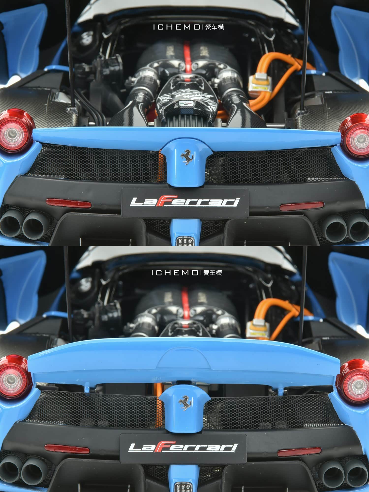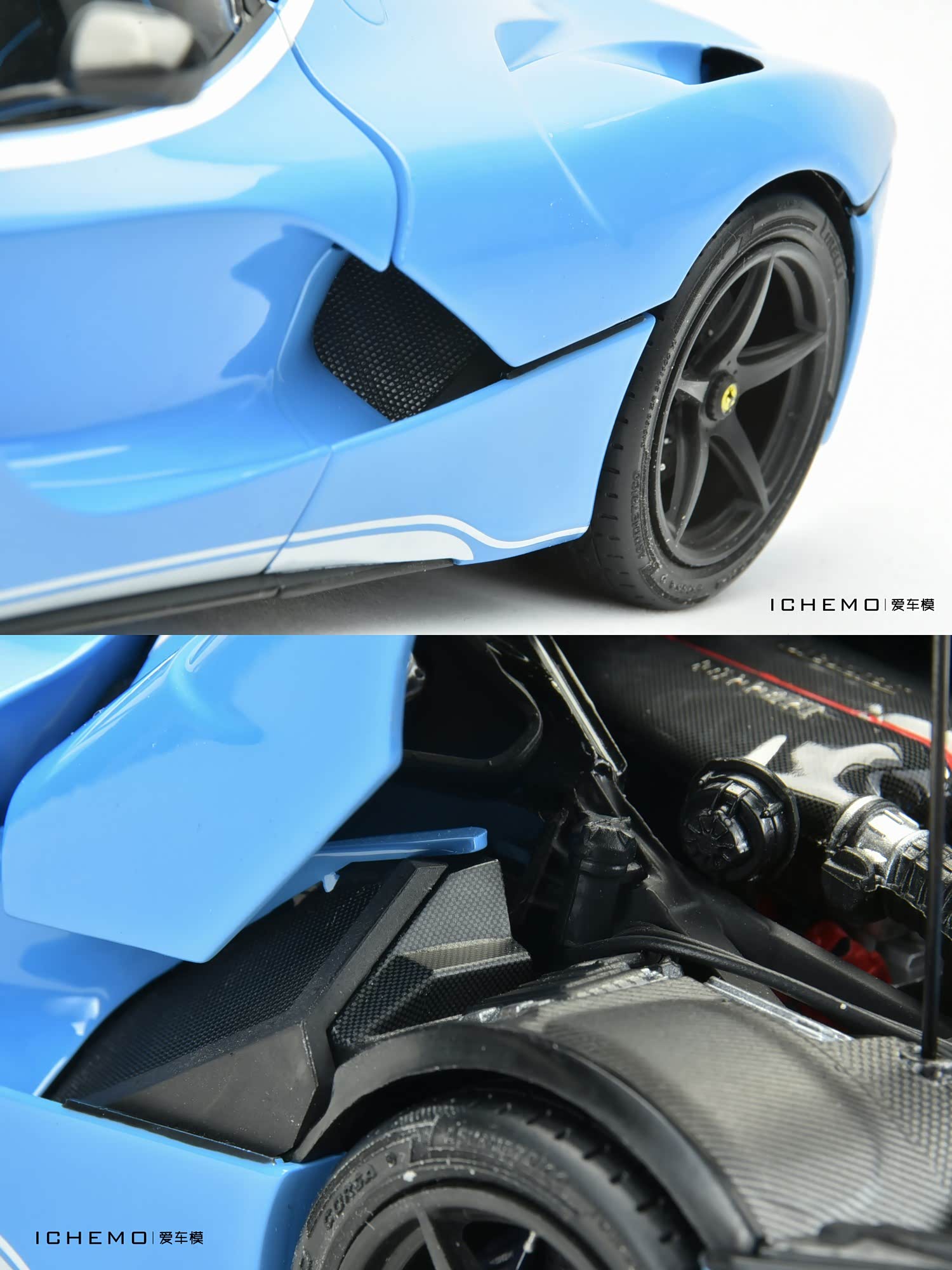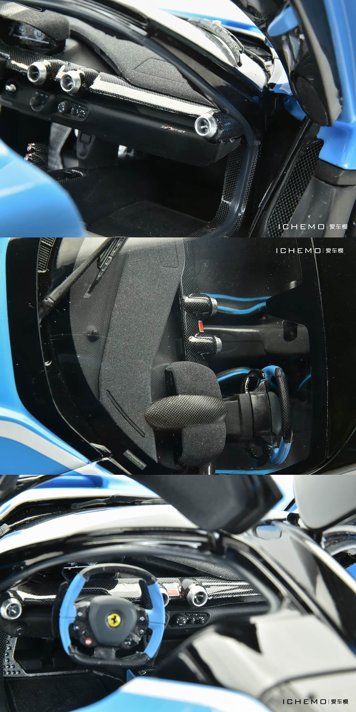 除涂装外,“Baby Blue” 的另一大特征是发动机(电机组)护罩上有签名,据说是 Ferrari 众工程师亲签,模型方面也还原了这一细节。顺便一提,网传这签名就是 “贾先生不洗车” 的直接原因。模型上这颗 V12 发动机可见包括本体在内的 “上层建筑”,但并不是完全独立结构;和内饰一样,发动机处 “碳纤维” 亮面也均有光油覆罩。
