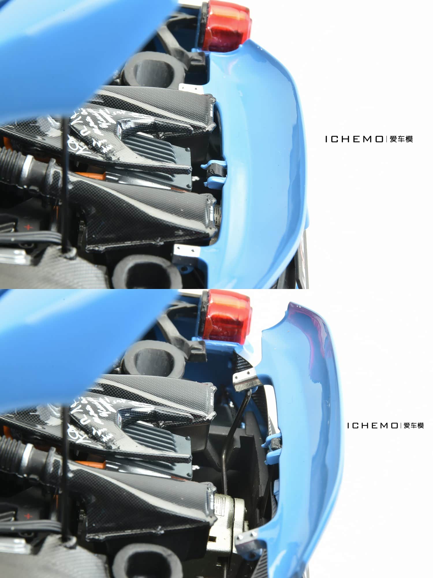 模型发动机舱盖保持开启需支撑杆辅助(随车附支撑杆 x 2),其负面有黑色涂装,中心位为透明件 - 有镂空蚀刻片等补强细节。