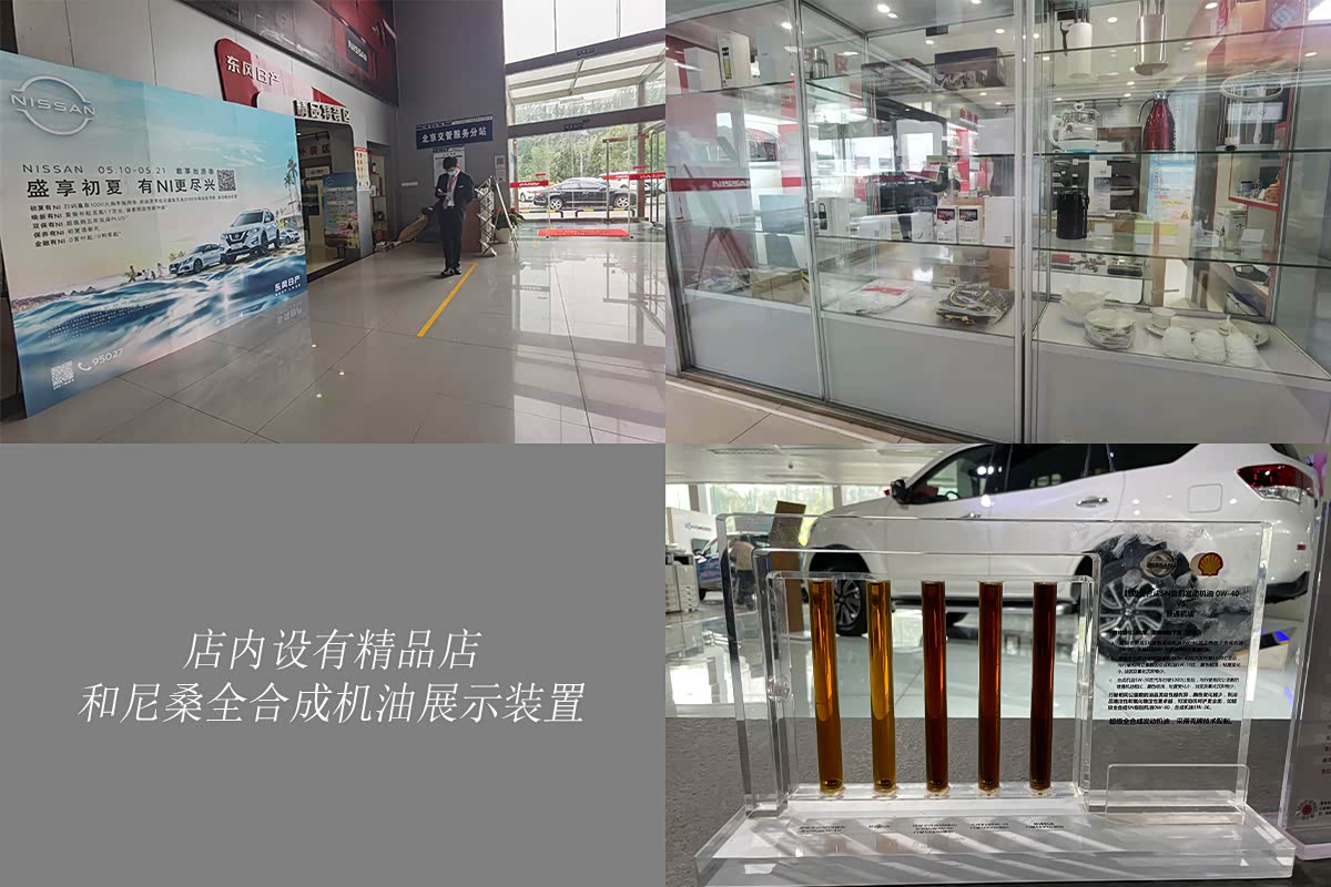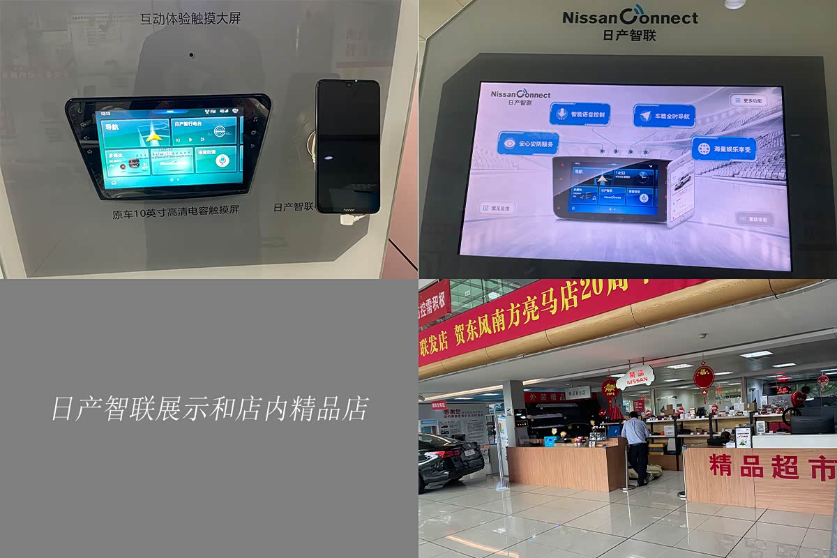 该展厅内展示了日产智联的车机系统,并且该店设有车用配件精品超市可供客户进行选购。