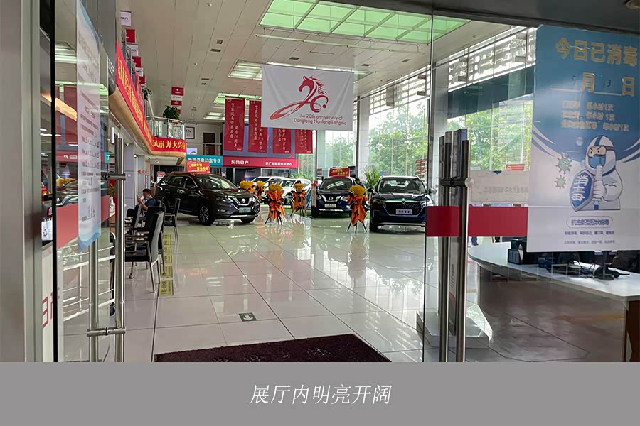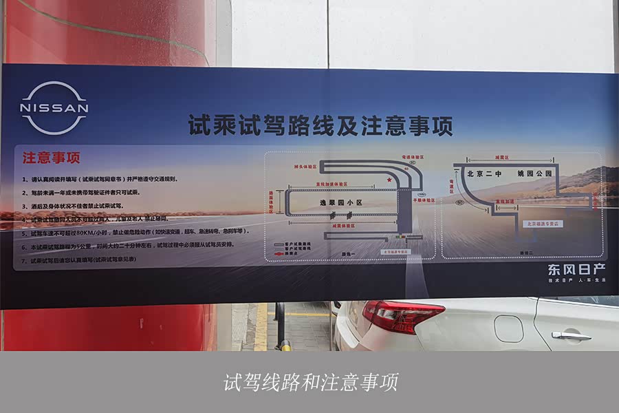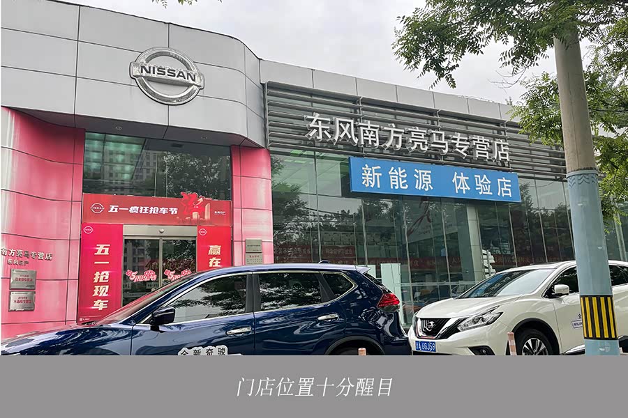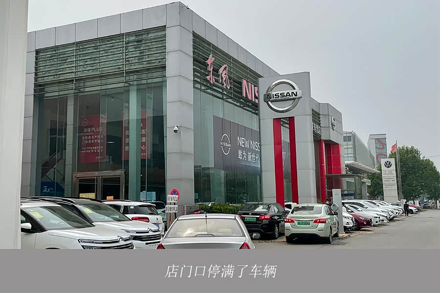 紧接着,笔者一行人驱车赶往位于姚家园路东方基业汽车城的第二家东风日产经销商,挂有NISSAN标志的广告牌十分显眼,该店位于汽车产业园区内,经销商门店较多,门口停满了各个品牌的试驾车和客户车辆,停车场十分拥挤。