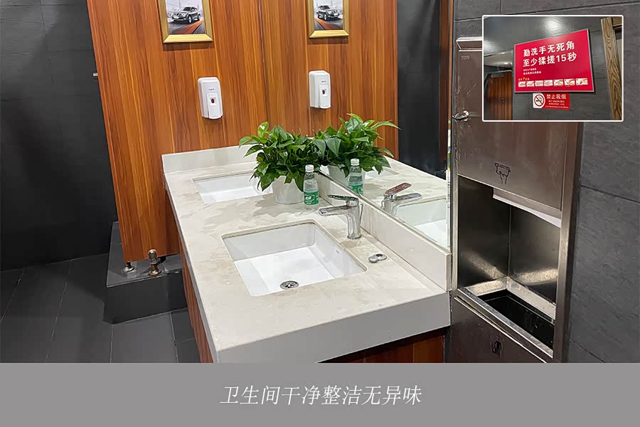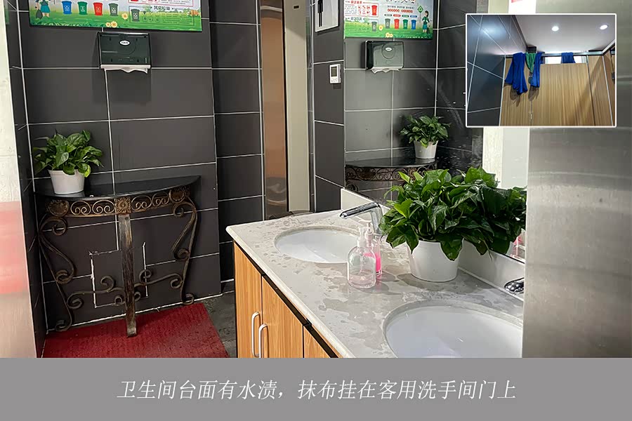 笔者来到洗手台发现,整体设施较新,地面配备防滑垫,整体灯光充足且通风良好,卫生纸补充很及时。美中不足的是台面水渍较多无人清理,且客用卫生间的门框上搭着清洁抹布,十分影响美观。
