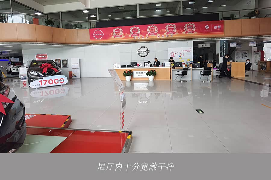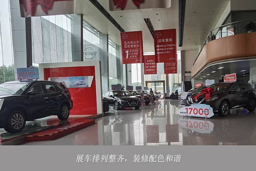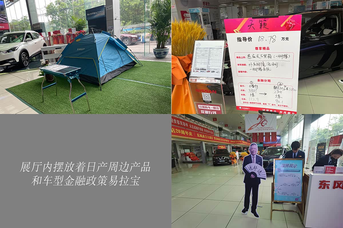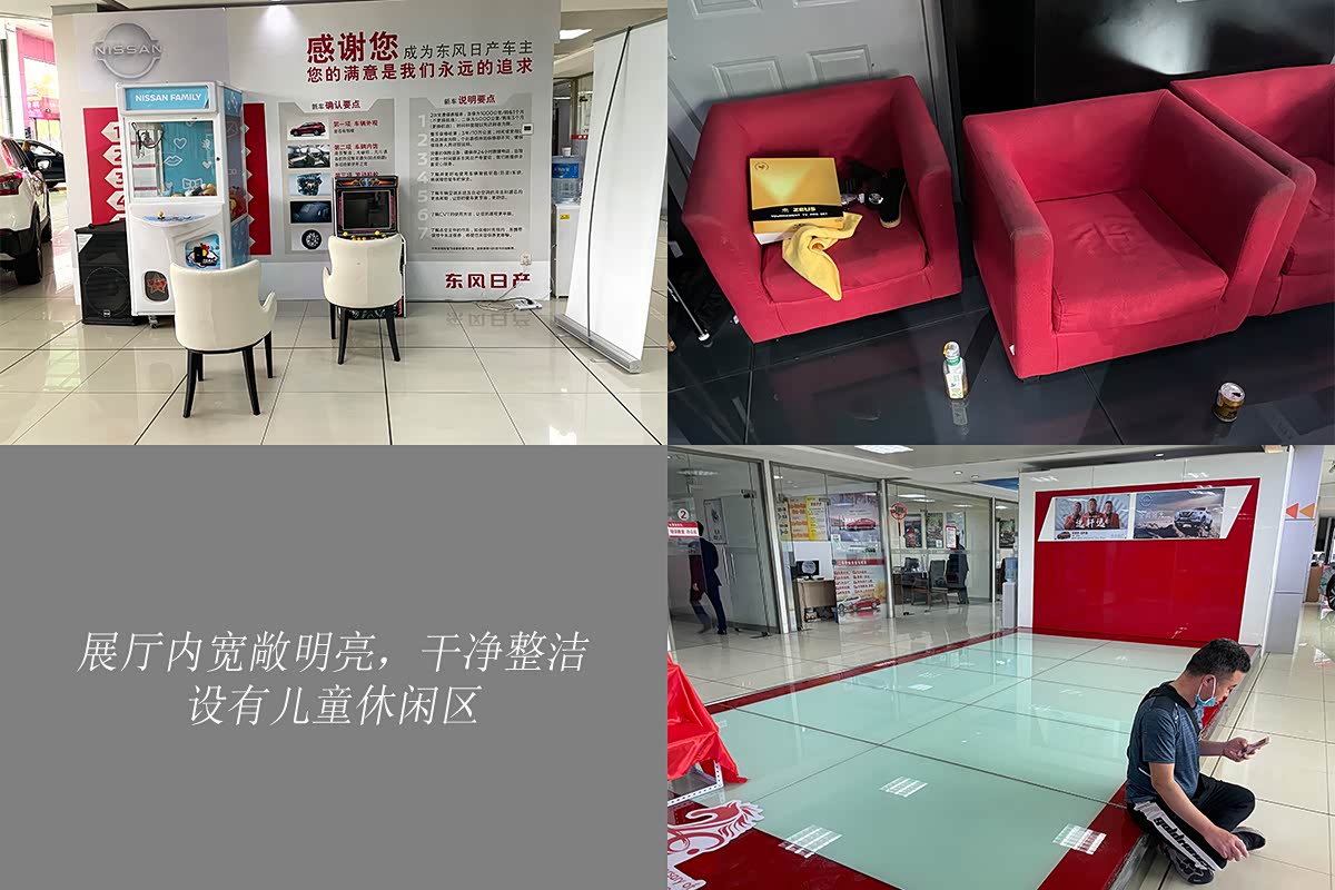 进入展厅内部,整个门店大堂装修稍显陈旧,但好在地面干净,采光良好,展厅内空间较大且展车之间距离适中,整体视觉观感还算合格。在展厅的周围摆放着印有日产logo的户外休闲娱乐用具以及各种店庆海报和报价展示牌,各种颜色映入眼帘,显得略微有些凌乱。