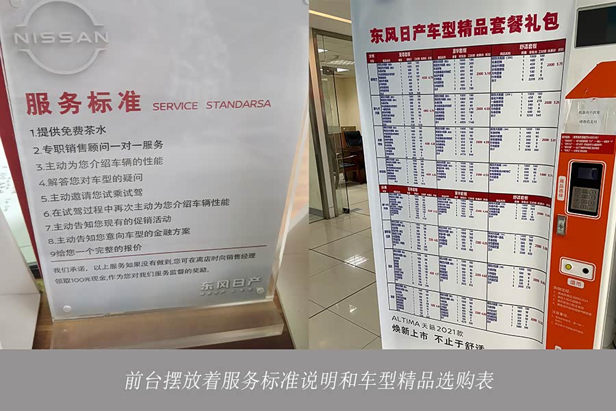 值得一提的是,笔者发现在前台的桌子上专门展示着服务标准说明。该店的服务标准共九条,并明文承诺销售在接待过程中未达到要求,客户可以在离店前领取100元现金作为监督奖励。