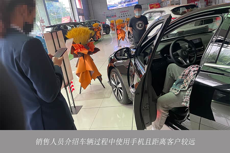 在接待环节中,销售在笔者一行人进门时较为迅速的进行了接待。在笔者了解和询问车辆配置等信息时,该名销售与客户的距离较远,存在一边低头使用手机一边与客户交流的情况,令笔者感到自己没有被重视,体验较差。