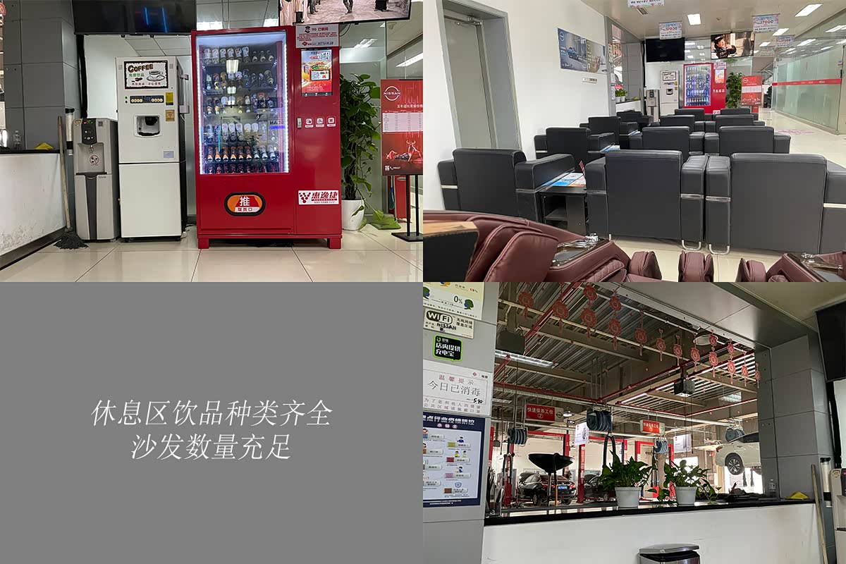 在硬件设施方面,此家经销商相对上家更加齐全,客休区配备了自动贩卖机和免费使用的咖啡机,同时配备了数量充足的沙发和按摩椅,并且提供电视可供客户休息使用。客户在休息的同时,可以透过玻璃窗直接看到维修保养车间的施工现场,方便客户查看车辆的维修保养进度。
