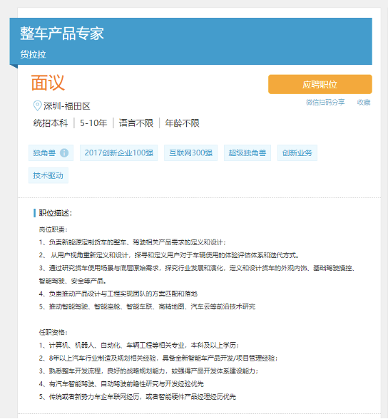 值得注意的是,招聘经验在5-10年,意味着招聘人士将是管理层人员,并且有着相对丰富的造车经验,以及项目的统筹能力。可以看出,货拉拉对造车方面的重视。