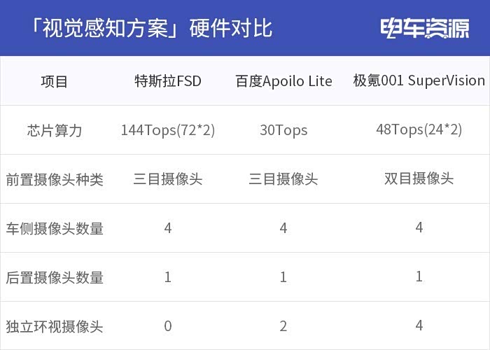 特斯拉搭载了8 颗摄像头,包括前置三目摄像头(分别是长距窄视角、中距中视角和短距鱼眼)、车辆的左右两侧各有 2 颗面向侧前和侧后的摄像头,再加上1 颗后置摄像头,8 颗摄像头完成了 360° 纯视觉感知的无死角覆盖,而百度的Apollo Lite 与特斯拉基本一致,只是加装了2 颗环视摄像头做感知补充。最后就是极氪使用的SuperVision 系统,与特斯拉和百度最大的区别就在于它使用的是前置双目摄像头,不过在能力上同样能达到既宽又远。