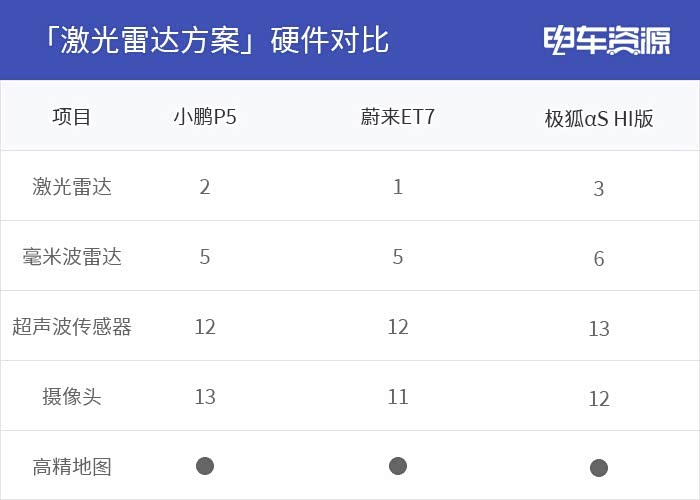 像小鹏P5、 蔚来ET7、极狐阿尔法S HI版都是使用的激光雷达方案,虽然他们他们在硬件的配备上有所区别,但是最终都能够在部分场景下实现L3级别的自动驾驶。例如:小鹏P5和蔚来ET7都能够在高速上手扶方向盘并观察路面的情况下让车辆自动驾驶,极狐αS HI版则是更加激进,可以在无需手扶方向盘的情况下在市区复杂环境下开启自动驾驶功能。
