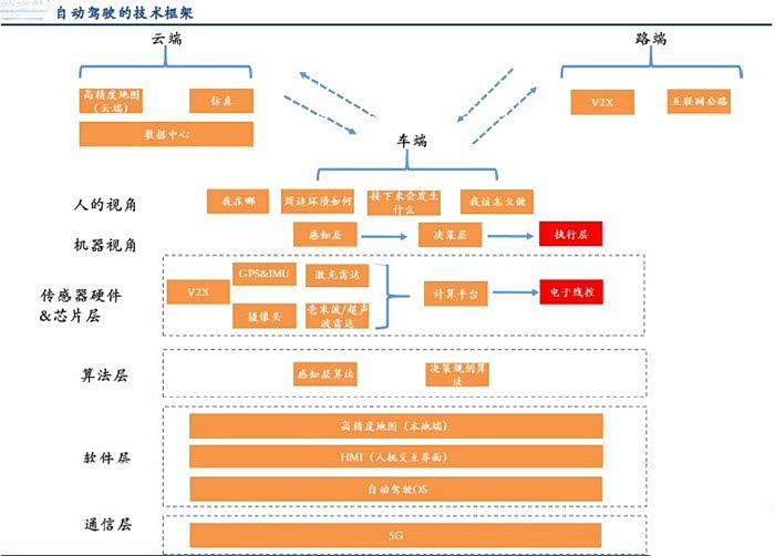 而完成这些辅助驾驶都需要依靠感知、分析、应用三大层面,其中感知层用来代替人的眼睛,通过传感器(激光雷达、摄像头、毫米波雷达、高精地图等)来采集驾驶员行驶过程中涉及到的驾驶信息。分析层则是用来代替人的大脑,通过获取到的信息进行计算,制定相应的控制策略。最后应用层则是代替人的手脚,将接收到的控制策略进行执行,其中包括加减速、转向等。