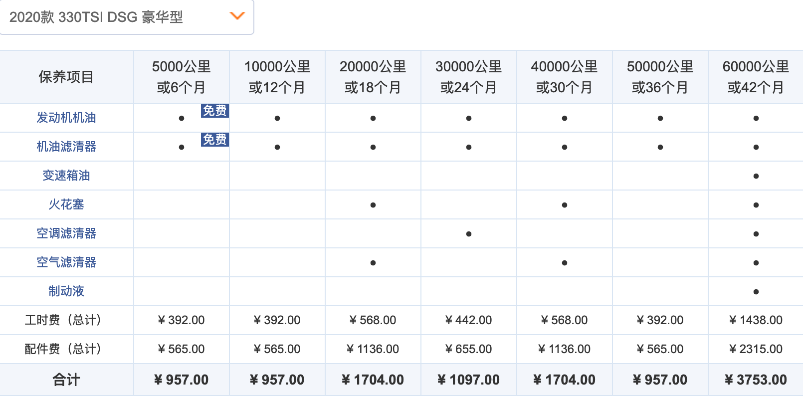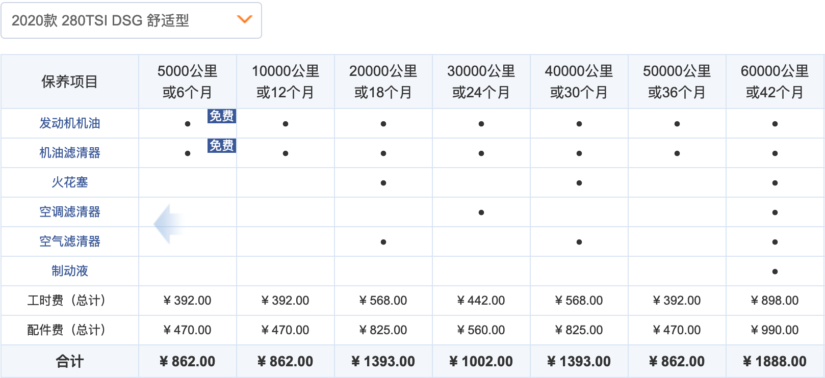 迈腾2.0T车型的保养价格比1.4T略贵一些,常规保养的费用达到了957元,其中机油和机滤费用为565元,工时费则和1.4T车型一样同为392元。2万公里的大保养费用为1704元。迈腾2.0T车型6万公里的累计保养费用为10172元。