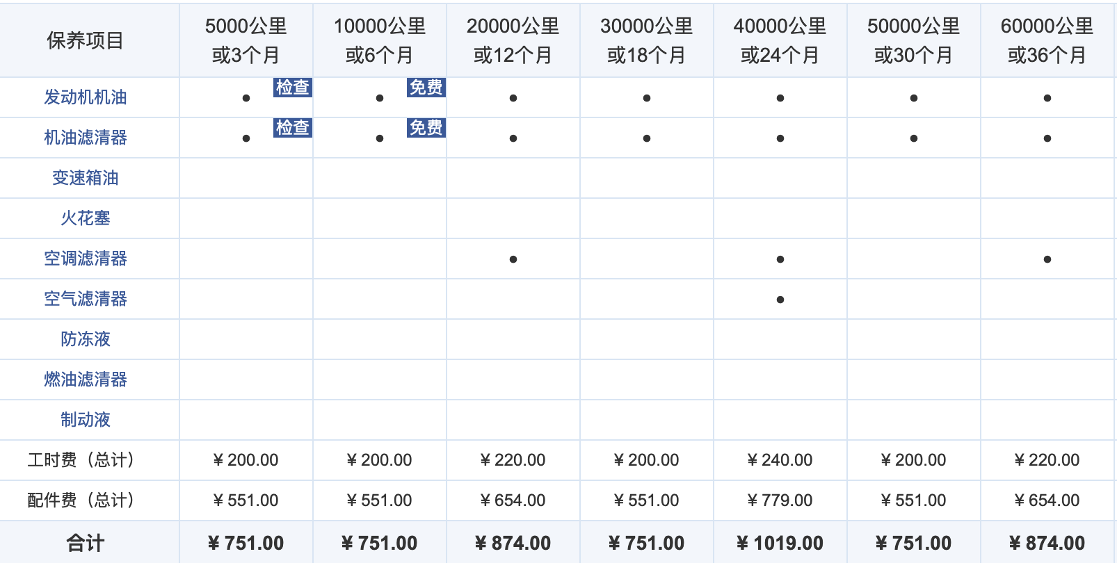 丰田凯美瑞的常规保养费用为751元,其中机油和机滤费用为551元,工时费为200元。2万公里的大保养价格为874元。凯美瑞的6万公里累计保养费用为4269元。