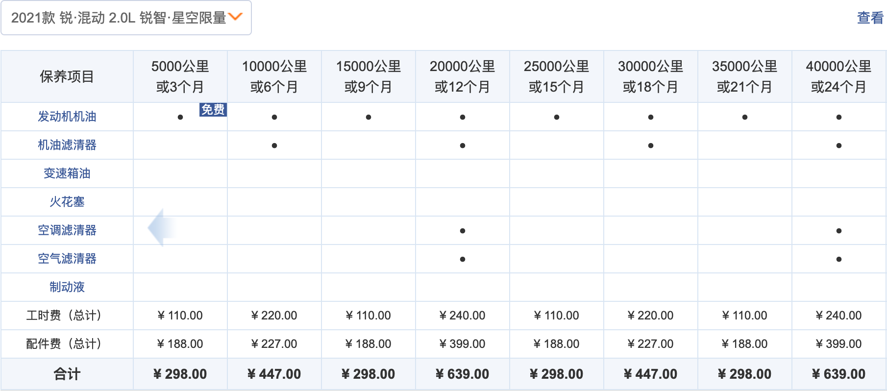 本田雅阁2.0L混动车型的保养费用基本上和1.5T车型相同,常规保养费用同为447元,但4万公里的保养费用比1.5T车型略低一些。雅阁2.0L混动车型6万公里的累计保养费用为5004元。
