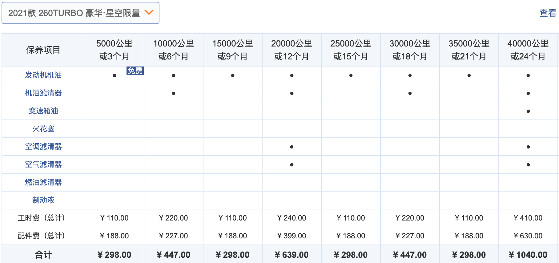 本田雅阁1.5T车型的常规保养费用为447元,其中机油和机滤费用为227元,工时费为220元。2万公里大保养的费用为639元。雅阁1.5T车型6万公里的累计保养费用为5405元。