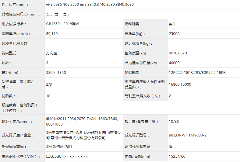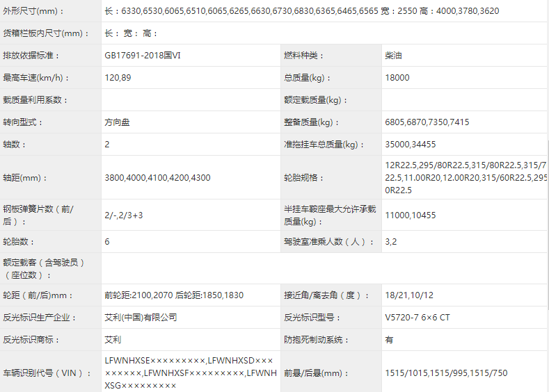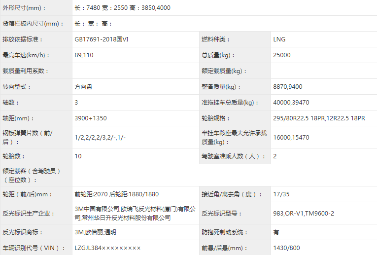 本期公告中,有一款陕汽德龙X6000 LNG 6×4牵引车亮相。该车配有潍柴13升燃气机,马力有400、430、460三种可供选择,整备质量为8870与9400KG。