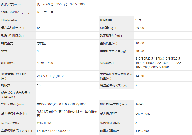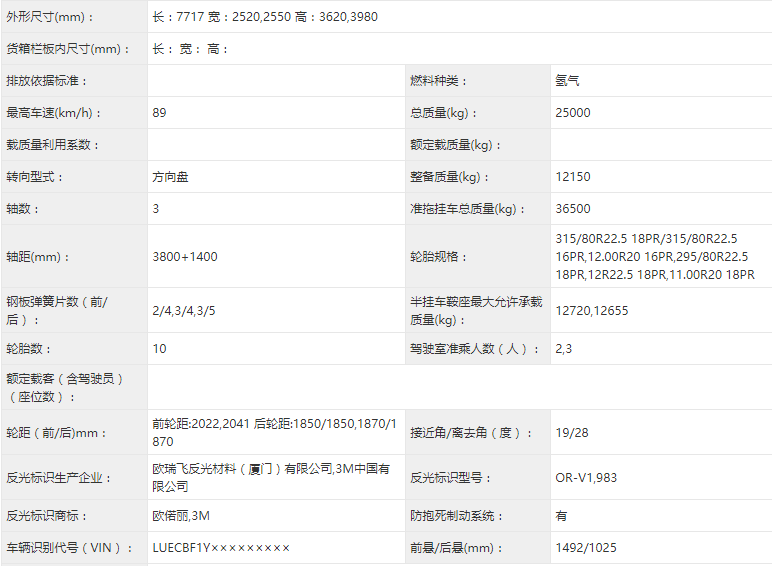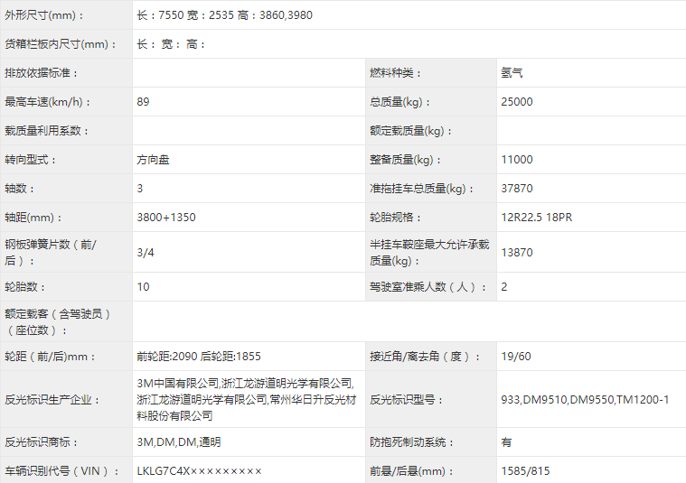 在本期公告中,苏州金龙带来了一款燃料电池半挂牵引车,产品型号为KLQ4250FCEV,整备质量为1.1吨。