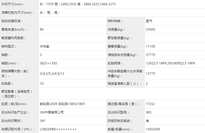 本期公告中,北汽福田公示了一款氢燃料电池牵引车,车辆型号为BJ4259FCEVPH,整车外形尺寸为7570×2490/2550×3866/3525/3494/3375mm,轴距为3825+1350mm;总质量为25000kg,整备质量为11100kg。
