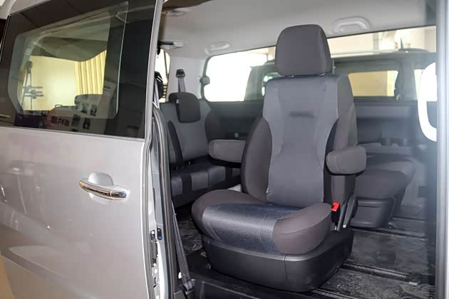 就以我们今天实拍的七座版为例,前排两个座椅的乘坐空间自不必说,无论是从坐姿还是空间来说都是相当棒的。第二排座椅配上两个独立座椅,而且这两座椅带滑轨可前后移动,并且还可360°旋转,在旋转180°的时候可与第三排座椅轻松组成一个临时会议室。