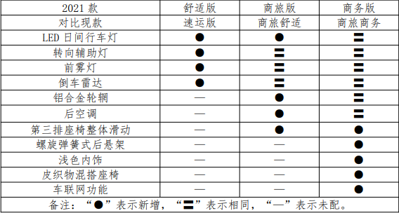 作为年度改款车型,2021款瑞风M4在外观内饰的设计上并没有太大的变化,它主要是对配置进行了调整,三款车型在配置上均有不同幅度的提升,总体来说性价比是更高了。具体配置调整见下图: