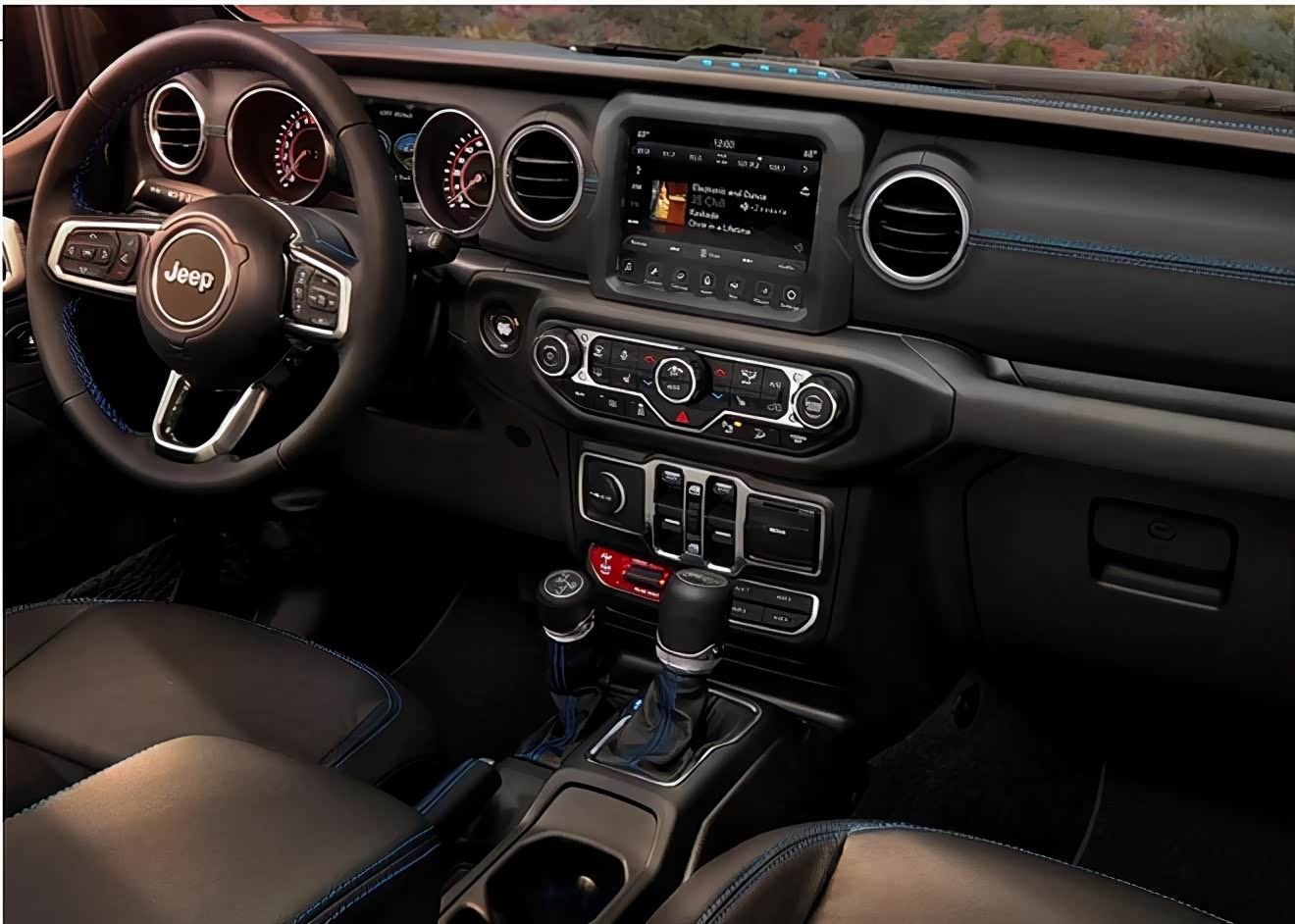 内饰方面,新车配备有液晶显示+机械指针组合式仪表盘、三辐式多功能方向盘、嵌入式液晶中控屏以及传统的机械式换挡机构等等。另外,新车还配备了四驱模式切换档杆。亮眼的是,中控台上的蓝色风险,色彩对比鲜明,年轻化十足。