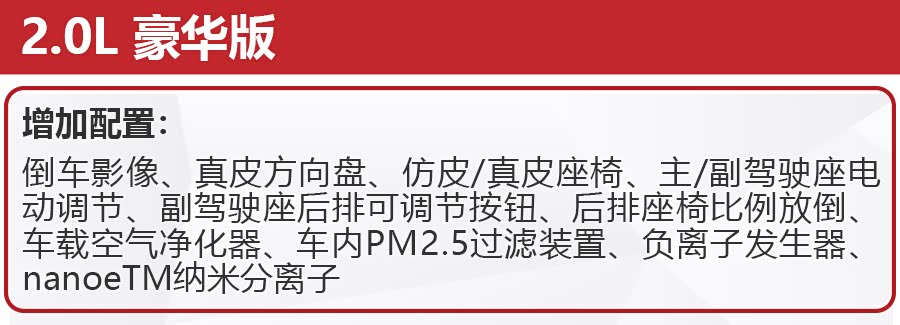 而2.0L 豪华版是小智最为推荐的车型,其配备了真皮方向盘、仿皮/真皮座椅以及副驾驶座后排可调节按钮,不论是档次感还是舒适性都得到了进一步提升。令车载空气净化器、负离子发生器、车内PM2.5过滤装置以及nanoeTM纳米分离子能打造一个更为清新的车内环境。
