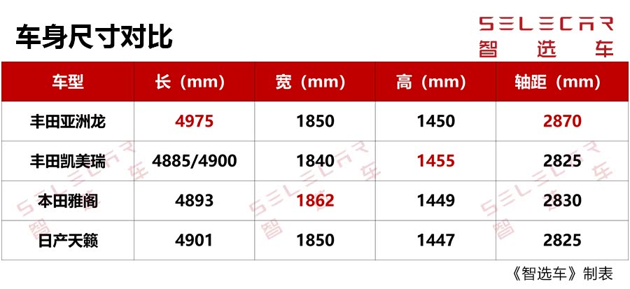 丰田亚洲龙虽然定位是中型车,但通过对比我们可以发现其车身尺寸,尤其是长度以及轴距相较3款传统日系热门中型车都占据了明显的优势,内部空间宽裕程度可想而知。