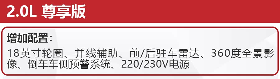 如果预算充足,也不妨考虑下2.0L 尊享版。虽说尊享版的厂商指导价比豪华版贵了7000元,但增加的18英寸轮圈令外观颜值更高,前/后驻车雷达、360度全景影像、并线辅助以及倒车车侧预警系统也进一步降低了这台大家伙的驾驭难度。