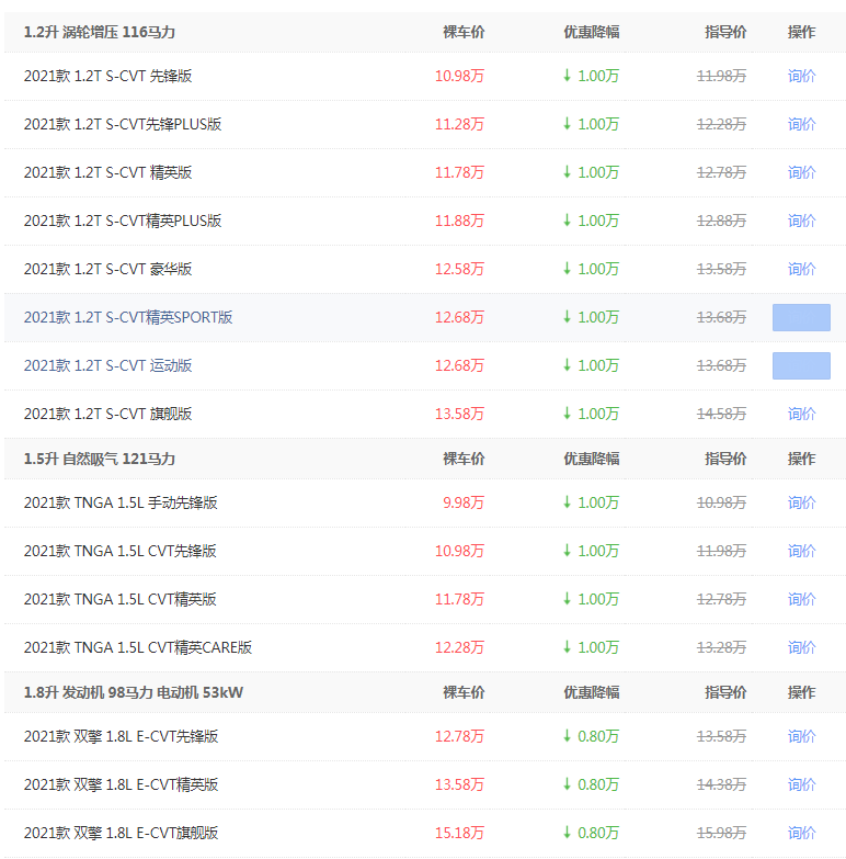 燃油版车型提供的是1.2T、1.5L发动机,匹配的是6挡手动、CVT变速箱,最大输出功率分别为116马力、121马力,双擎版车型提供的是1.8L+电动机的动力总成。