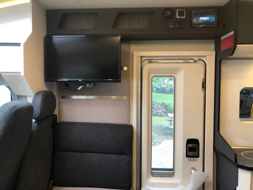 车辆的电视采用壁挂的方式,安装在车辆右侧座椅上方,主要照顾卡座区域使用。
