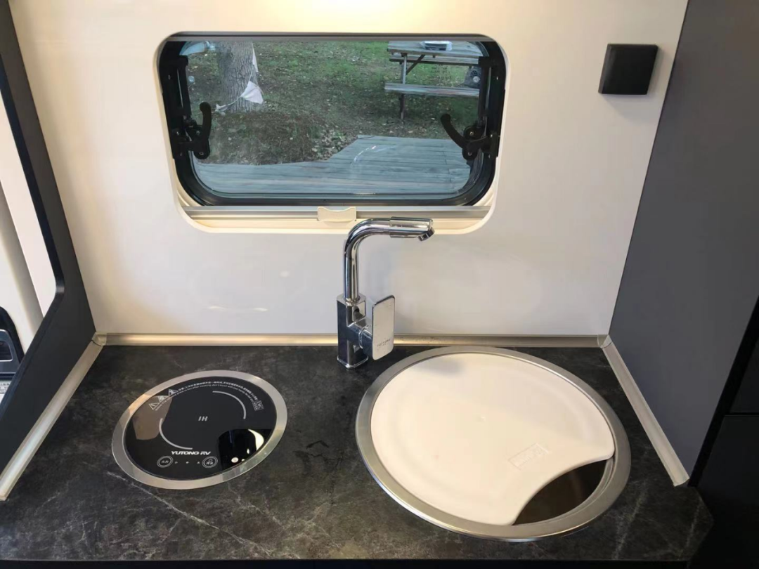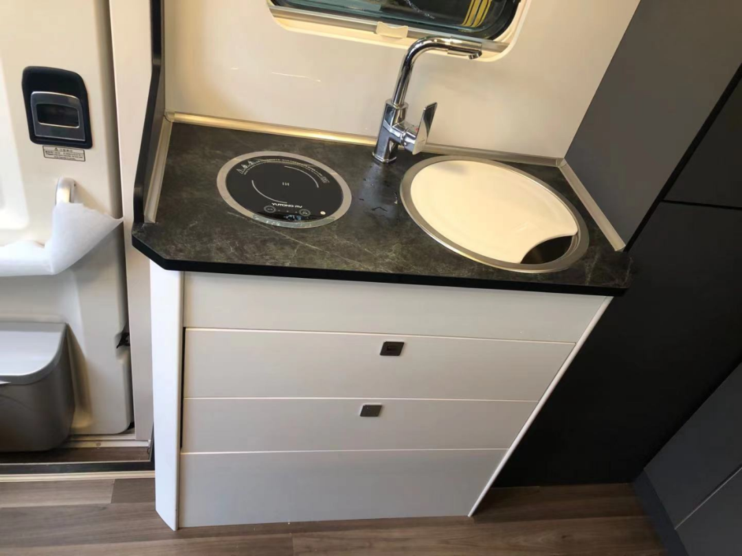 厨房区域安装了电磁炉和带盖水槽,深色台面契合整车内饰的设计风格。