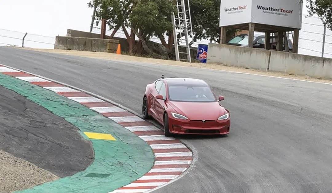 就在上周六,特斯拉测试团队再次把两台 Model S Plaid 三电机版原型车送到拉古纳·塞卡赛道 (Laguna Seca) 进行圈速测试。据媒体在现场拍摄的短片粗略计时得知,安装了主动型尾翼的那台红色 Model S Plaid 跑出了1分29秒92的圈速成绩,跟 Randy Pobst 掌舵时的保时捷918 Spyder (1分29秒89) 一样快!