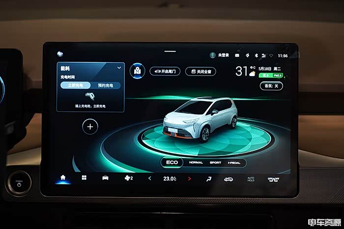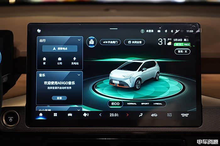 Aion Y整个中控区域由一块14.6英寸的液晶屏加上屏幕下方少量物理按键组成,基本绝大多数操作都可通过这块液晶屏完成。在处理器使用的型号上官方并未公布,但根据我们一段时间的体验来看,整体的表现还比较不错,不会出现明显卡顿的情况,在清晰度上的表现也十分出色。