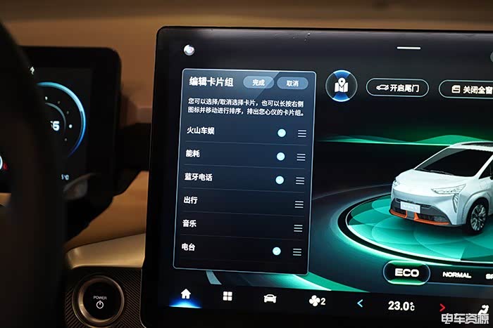 Aion Y这块14.6英寸的中控屏首页的功能设置非常直观,左侧主要设置了平时常用的功能,例如出行(导航)、音乐等,通过下滑方式即可调节,另外,还可根据自身爱好进行顺序设置、删除,不过出行(导航)与音乐功能无法删除。