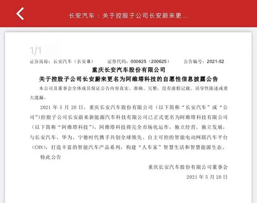 2021年5月20日,长安汽车发出公告,公司控股子公司长安蔚来新能源汽车科技有限公司已正式更名为阿维塔科技有限公司(“阿维塔科技”)。信息公告当中指阿维塔科技将与长安汽车,华为,宁德时代一起共创智能电动网联汽车平台,结合早前两日华为要与长安打造高端电动车品牌AB的消息来看,阿维塔科技就是这一具体执行的公司,蔚来也从新公司名字当中去除,这也意味着长安与蔚来的这项合作痕迹完全的抹去。