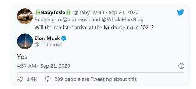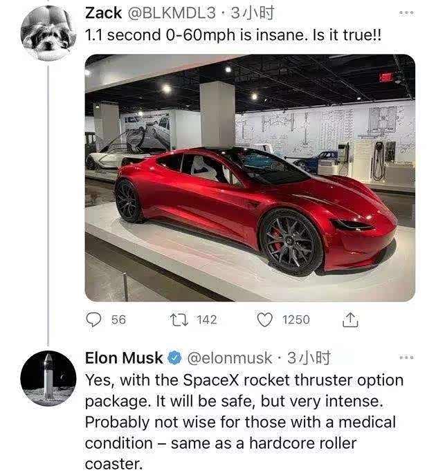 当然,关于Roadster 2跑车提供选装包,特斯拉CEO埃隆·马斯克对此也进行了证实。据悉,Roadster 2内置三个电动机,分别在前部一个,后部两个。其采用四驱驱动,最大扭矩可以达到10000N·m,0-60英里每小时只需要1.9秒,百公里加速只需4.2秒,最高时速可以达到400公里,续航里程或将超过1000公里。当然,加装SpaceX选装包后,其性能数据将更进一步得到提升。