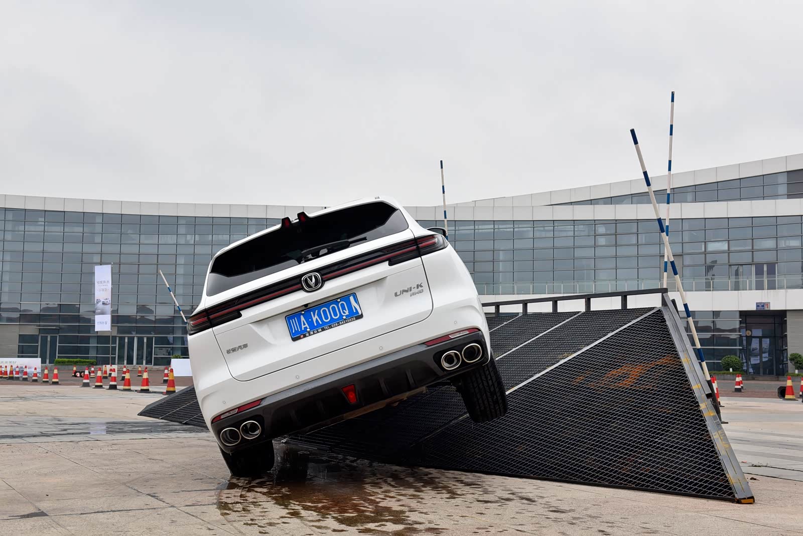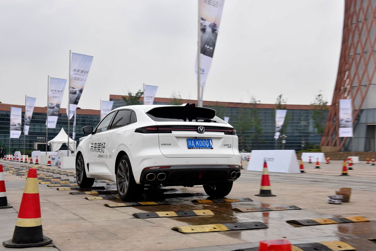 而起伏路面和颠簸路面,也是对四驱系统和底盘调校的考验。长安UNI-K的底盘调校给人的感觉是游刃有余的,韧性不错,再加上座椅的柔软度特别舒服,悬挂避震和滤震效果再加上软软的座椅,驾驶员更够很舒服地驾驶这辆车了,而不会特别难受。