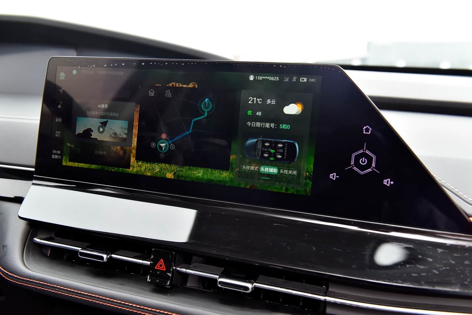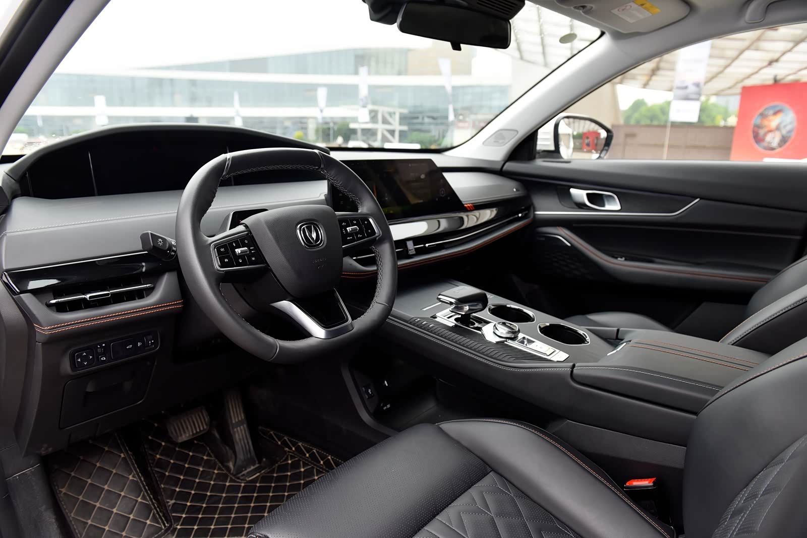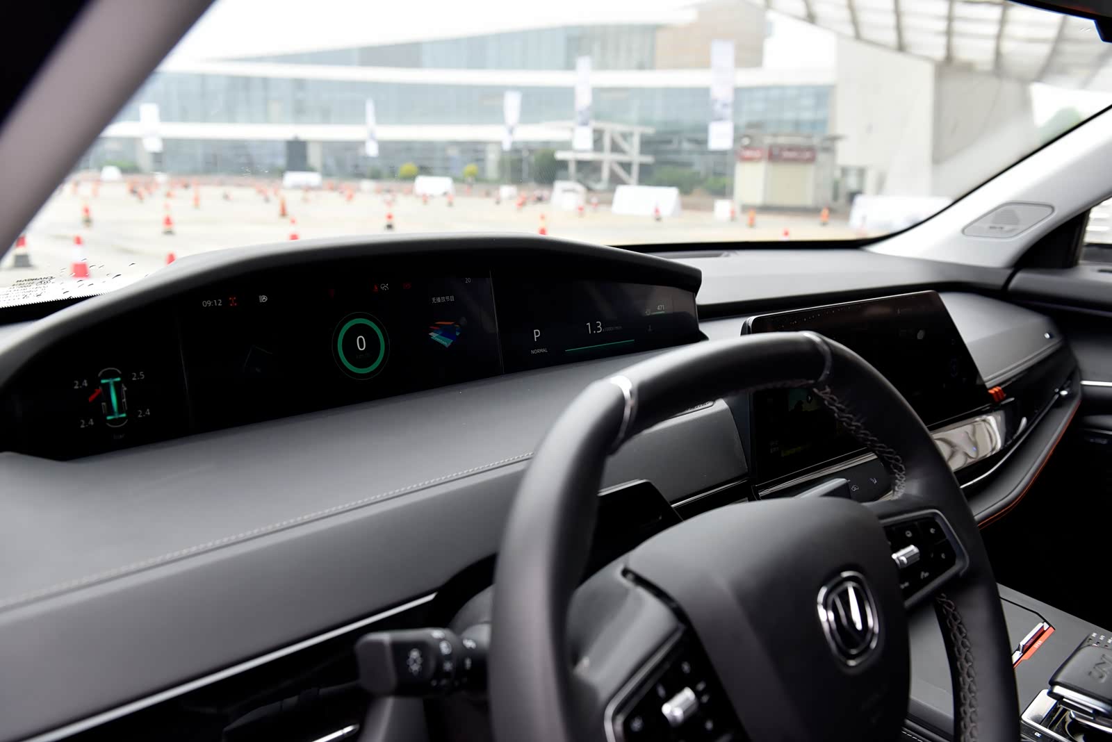 车内设计我们还可以看到,中控台上的四块液晶屏非常吸引眼球,全液晶仪表盘由3.5+10.25+9.2英寸三联屏组成,12.3英寸中控屏采用悬浮式设计,带来的科技感不错。车辆内置系统搭载了长安in call车联网系统,拥有AR实景导航、手势交互等功能。体验AR实景导航的时候,清晰度还是令人满意的,达到了高清画质。