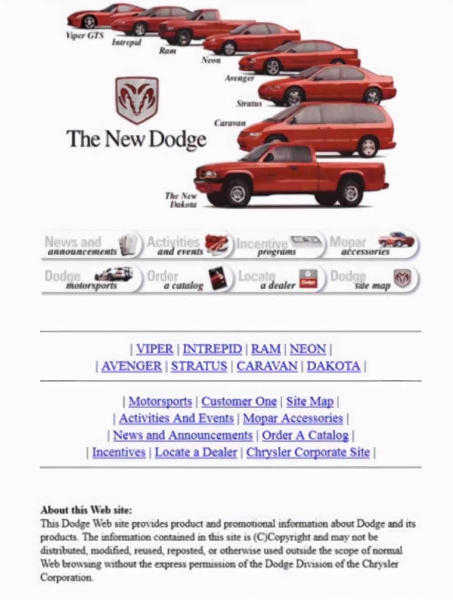 不得不承认,诞生于美国的互联网确实也让许多美国汽车品牌在那个年代成为了最早拥有网站的企业。道奇的网页设计虽然在今天看起来毫无设计感,但是在那个年代已经称得上美观了。