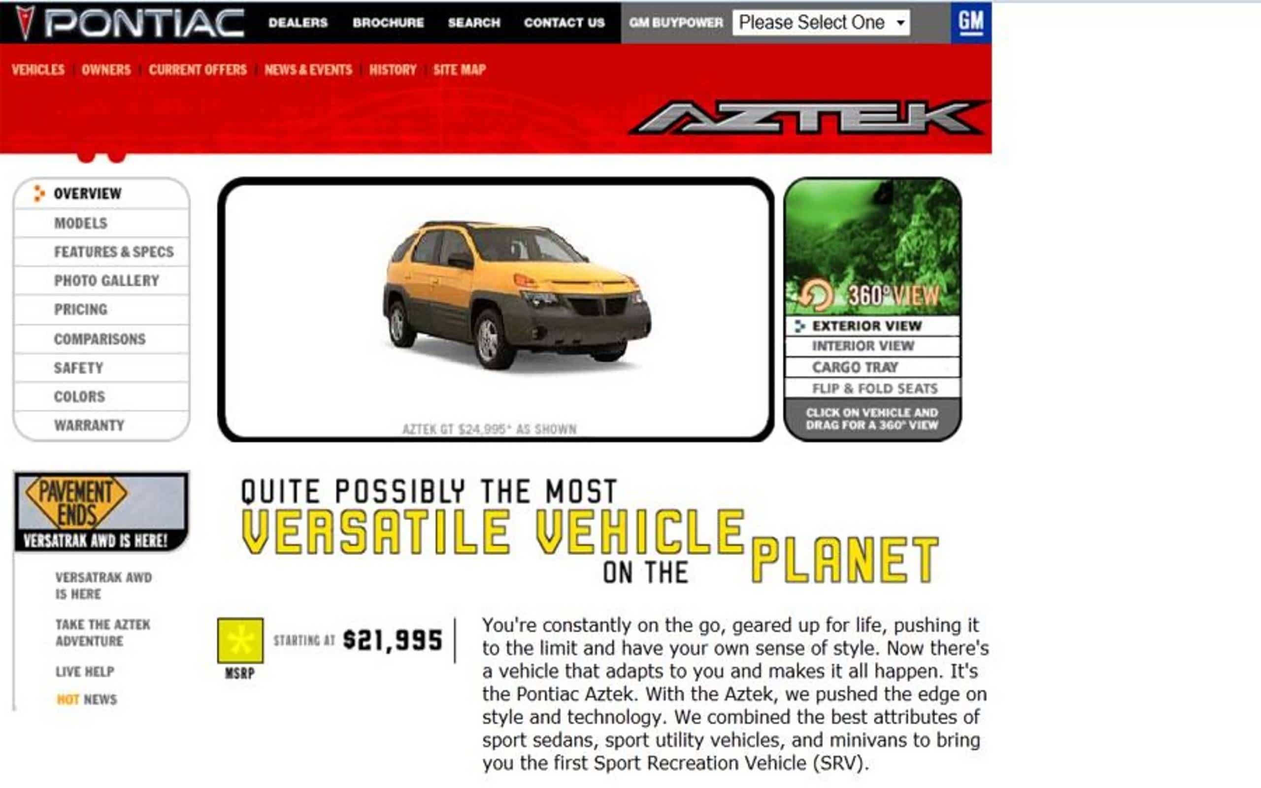 从那个时候开始,大量的汽车厂商也开始认识到互联网的重要性,纷纷建立了自己的品牌网站。比如上面便是美国通用汽车公司旗下的庞蒂亚克网站,上面的C位主角相信大家也不陌生,它就是《绝命毒师》中老白的座驾庞蒂亚克AZTEK。