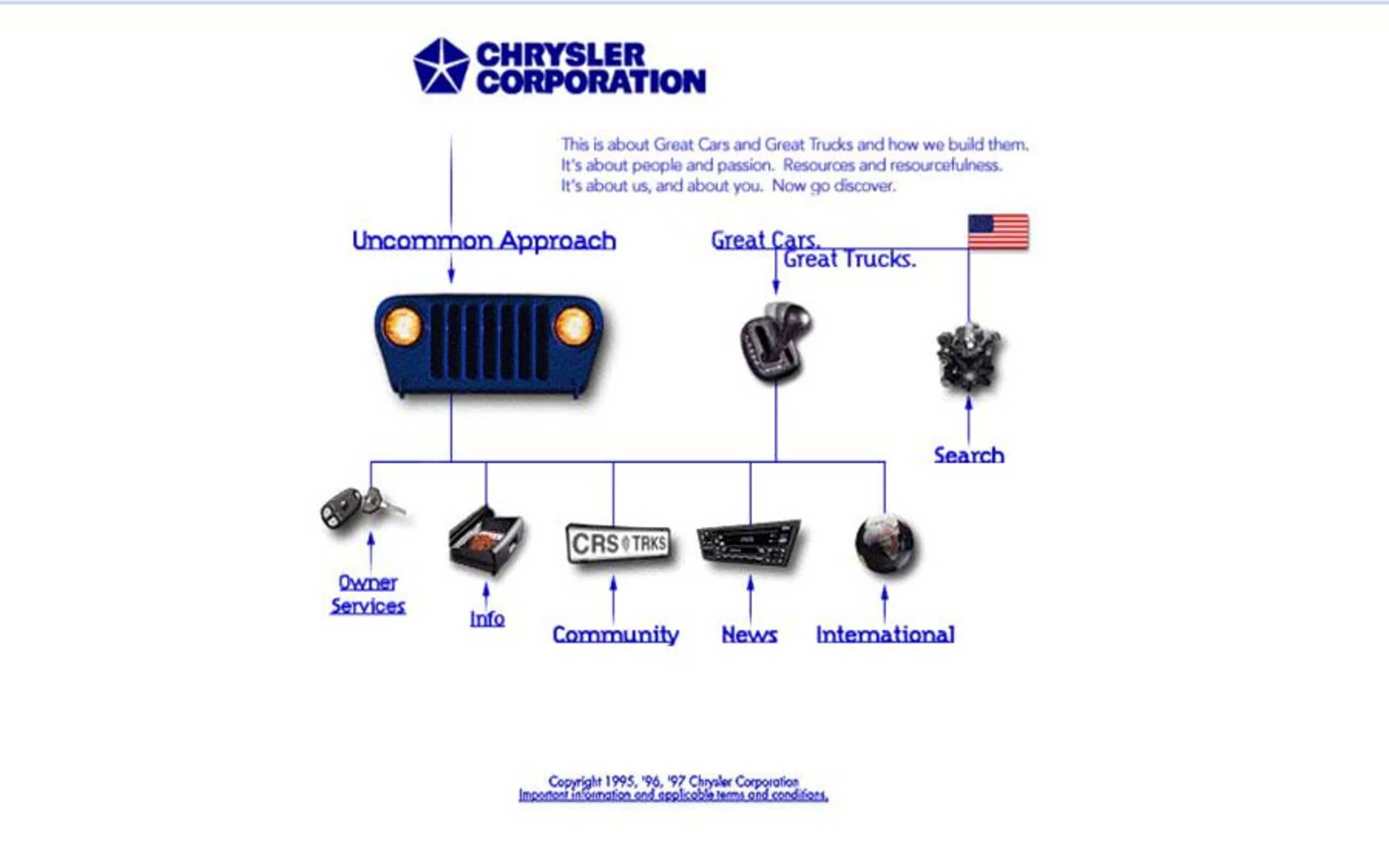 克莱斯勒对于网站的理解应该是某种思维导图,也许设计这个网页的人是一位专业的PPT工作者。不过,这样的设计也许更能够帮助那些初次网上冲浪的用户找到他们想要的信息。