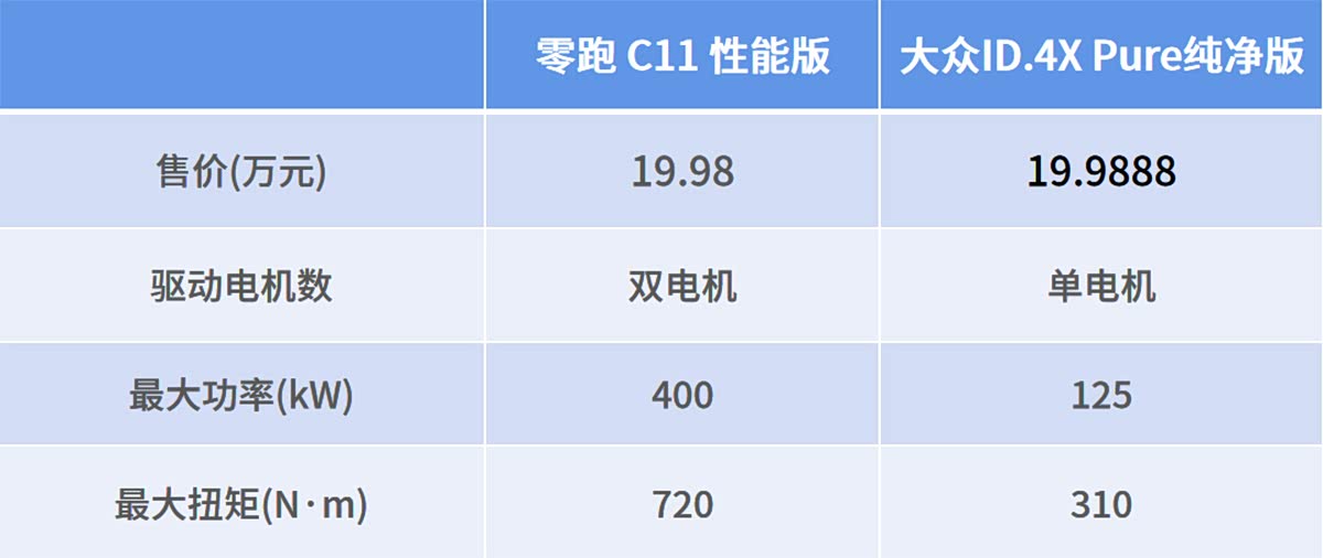 而且,零跑C11也是20万以内同级唯一双油冷电驱四驱版的新能源车型,性能版的最大功率达到了400kW,最扭矩达到了720N·m,0-100km/h的加速时间仅需4.8秒。同样的价格,大众ID.4X Pure纯净版只配备了单电机和两驱系统,最大功率为125kW,最大扭矩为310N·m,0-100km/h的加速时间虽然官方没有公布,但估计也得8秒开外了吧。